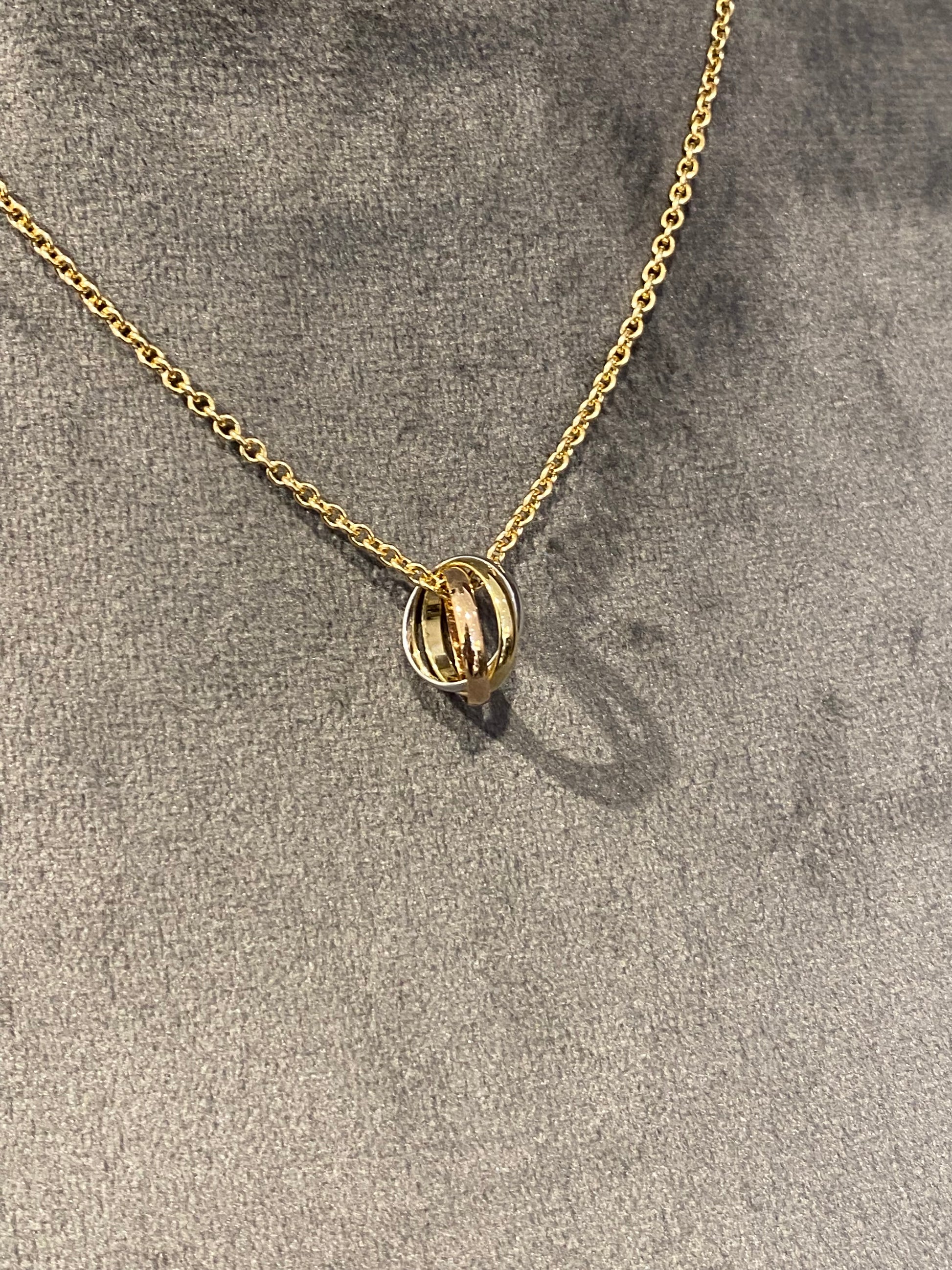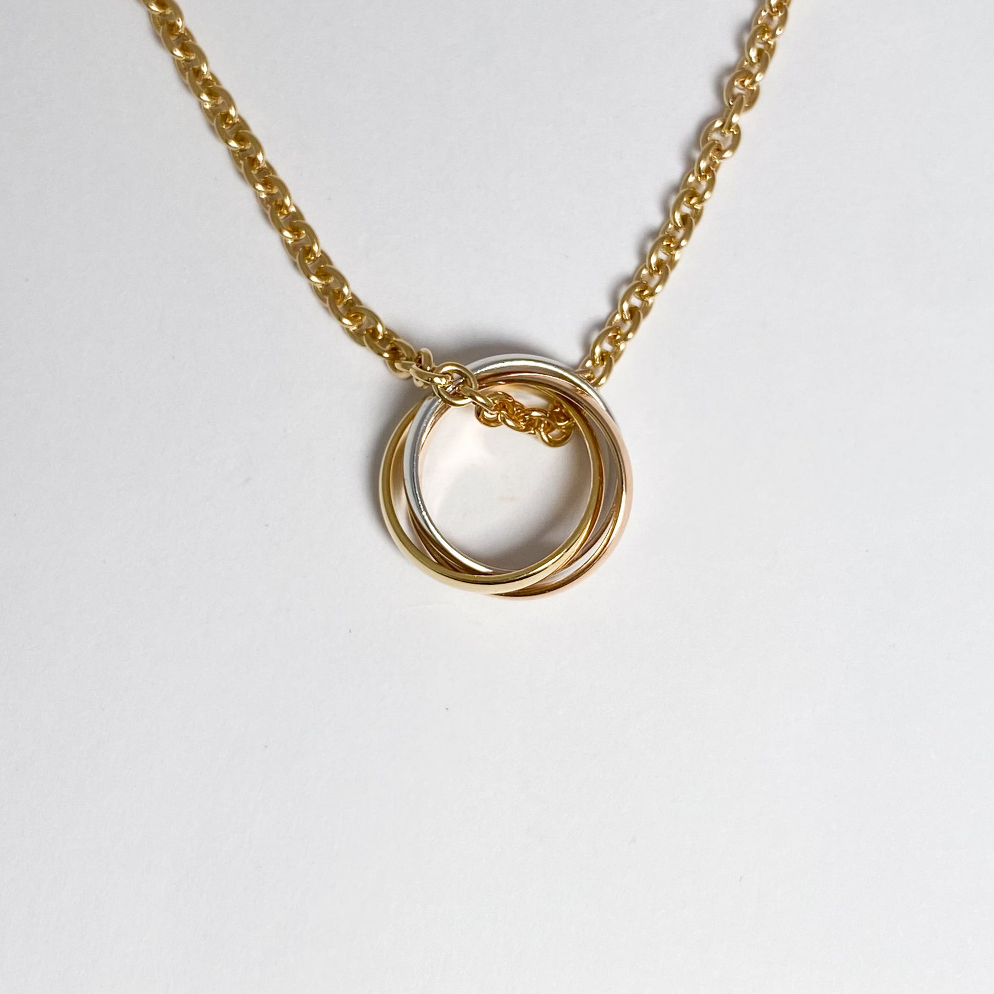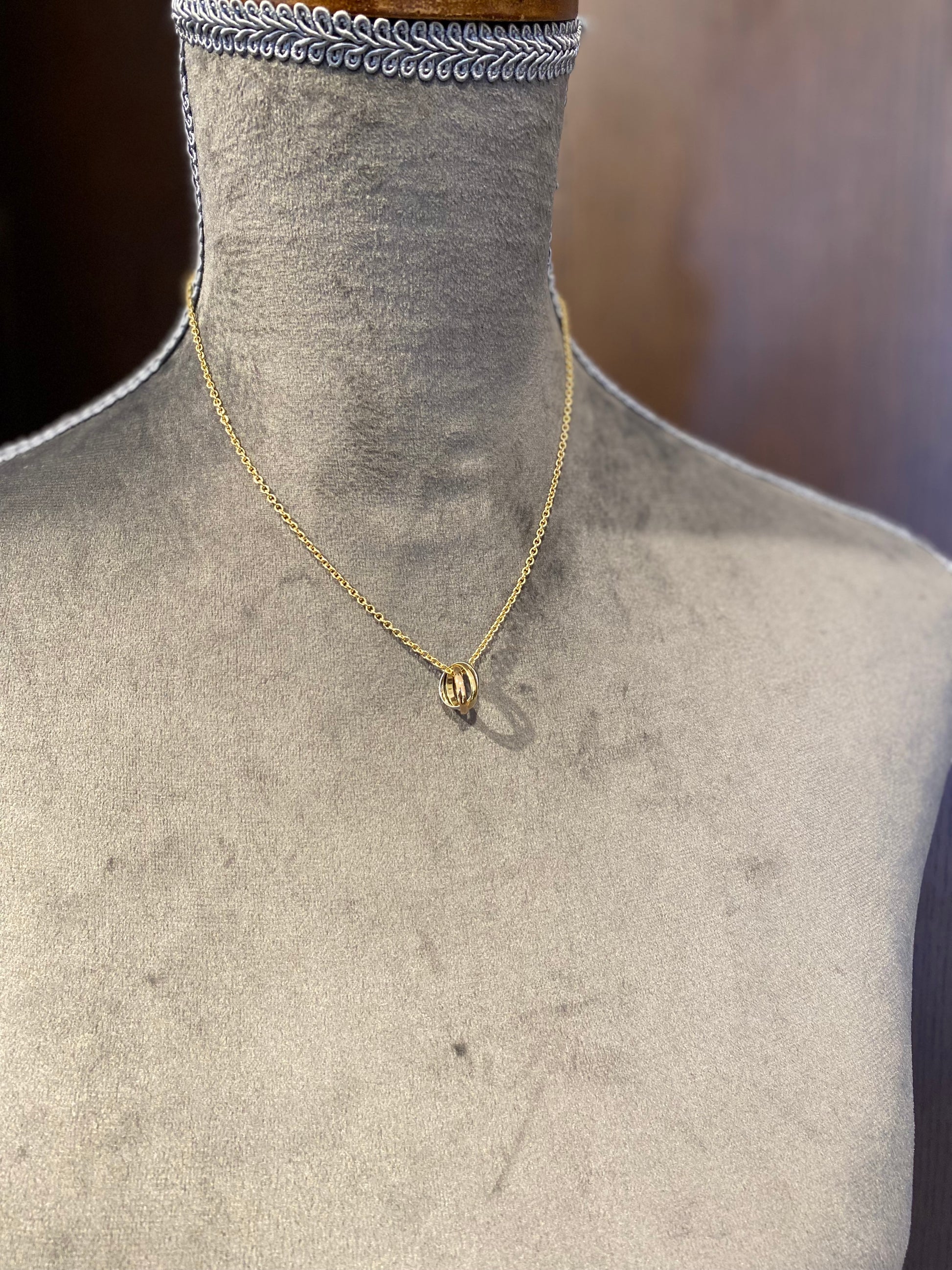 イエローゴールド、ホワイトゴールド、ピンクゴールドの三色が重なり合う、時代を超えて愛される定番デザインです。シンプルでありながら存在感があり、日常からきちんとした装いまで幅広く活躍します。