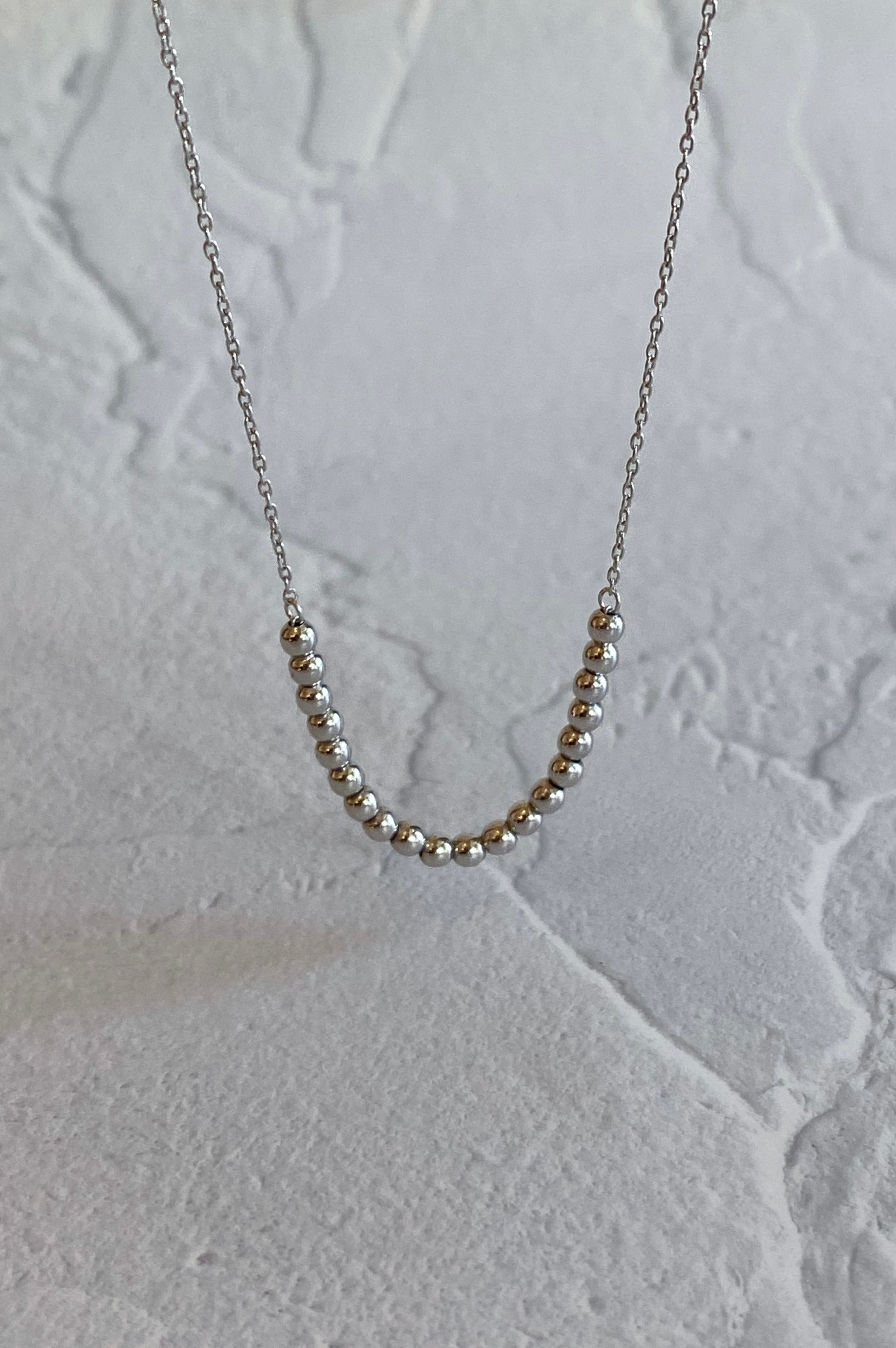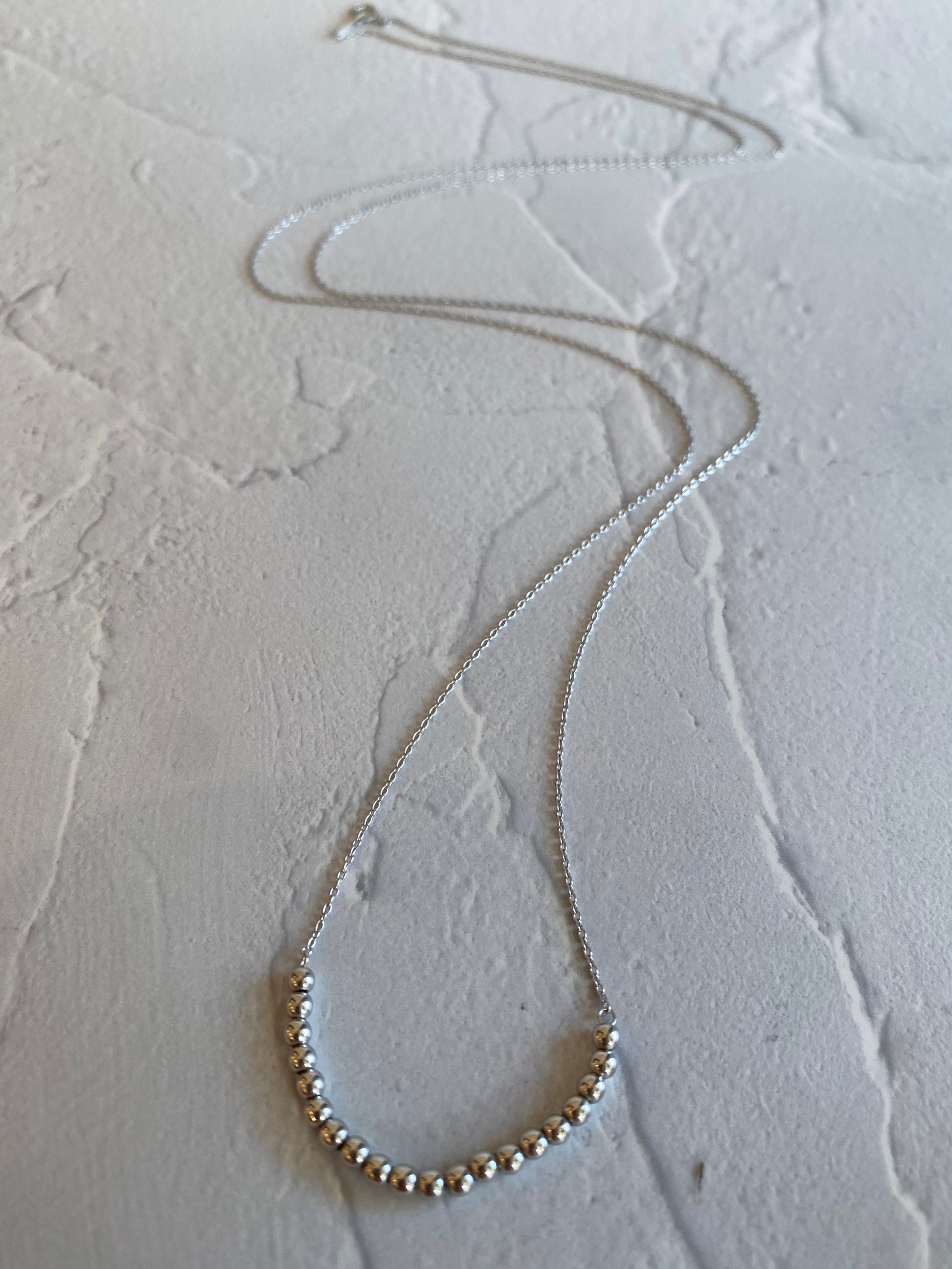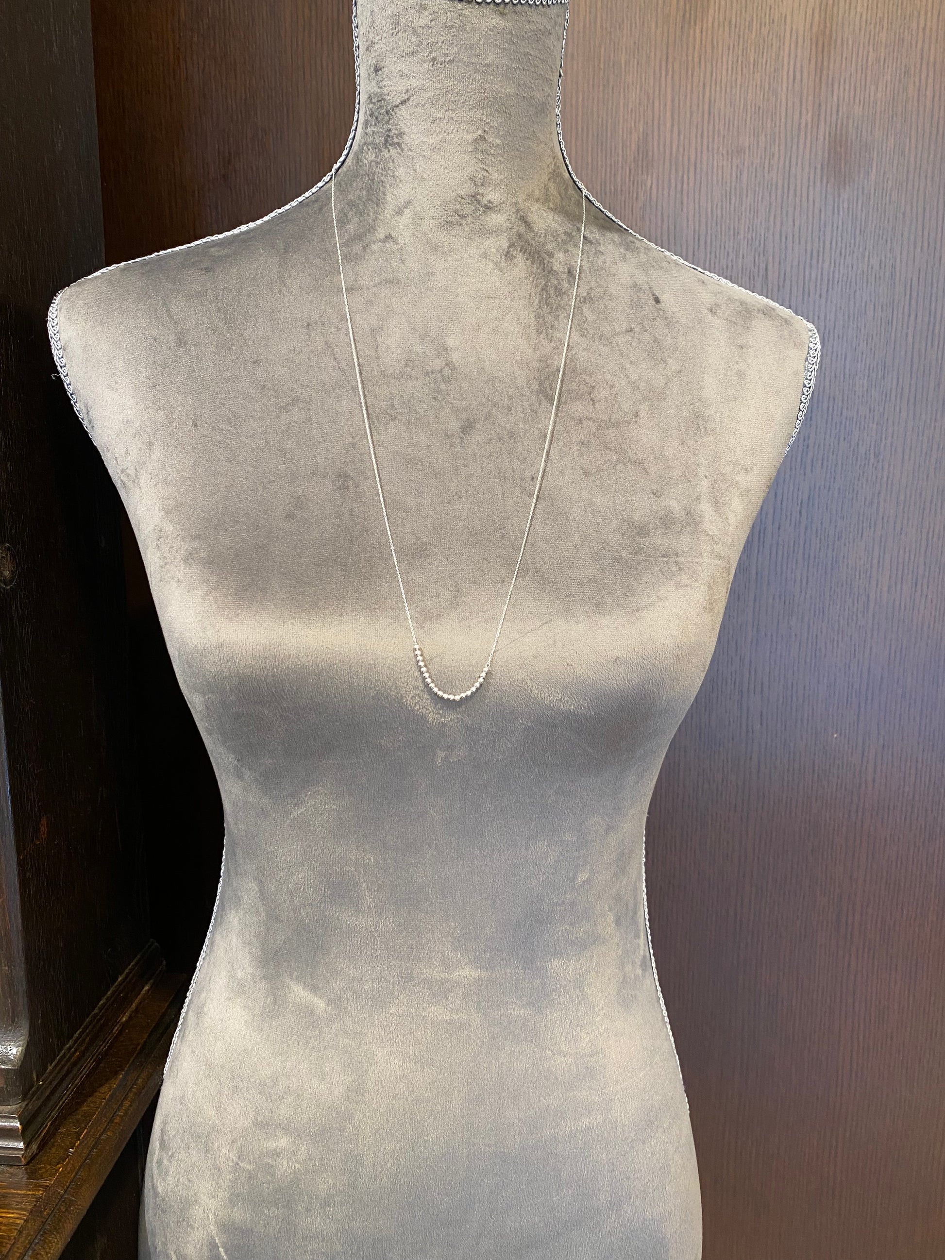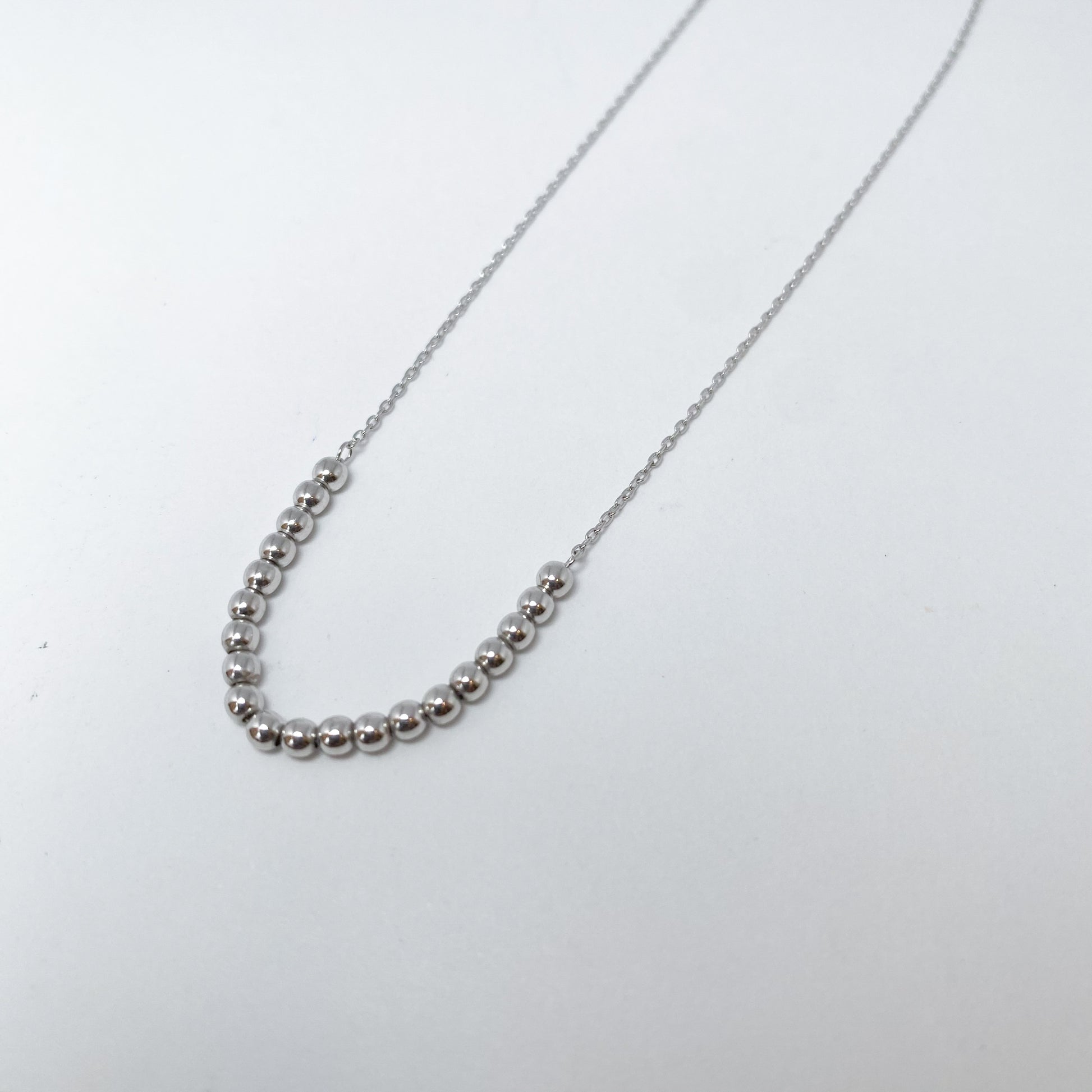 全長75cm、ホワイトゴールドのアズキチェーンに2.5mmの丸玉を並べたロングネックレスです。丸玉はチェーンに固定されており、動かない仕様になっています。