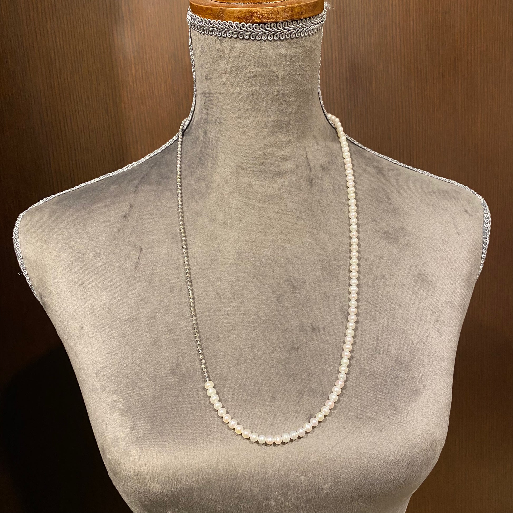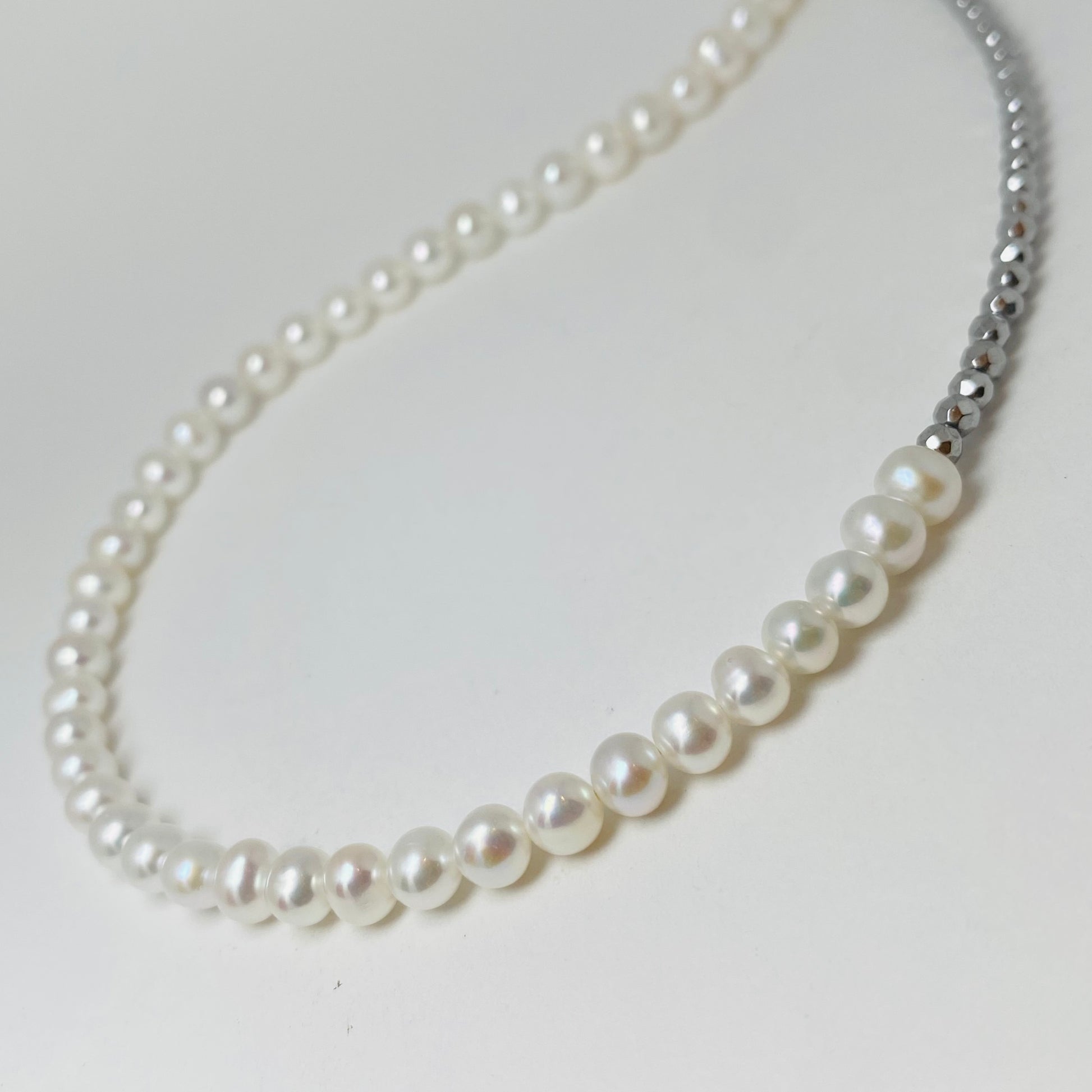 6ミリの淡水パールとカットがきらめく銀色のヘマタイトはさっとつけるだけでスタイルに抜け感をプラスします。軽やかに日常使いできるロングネックレスです