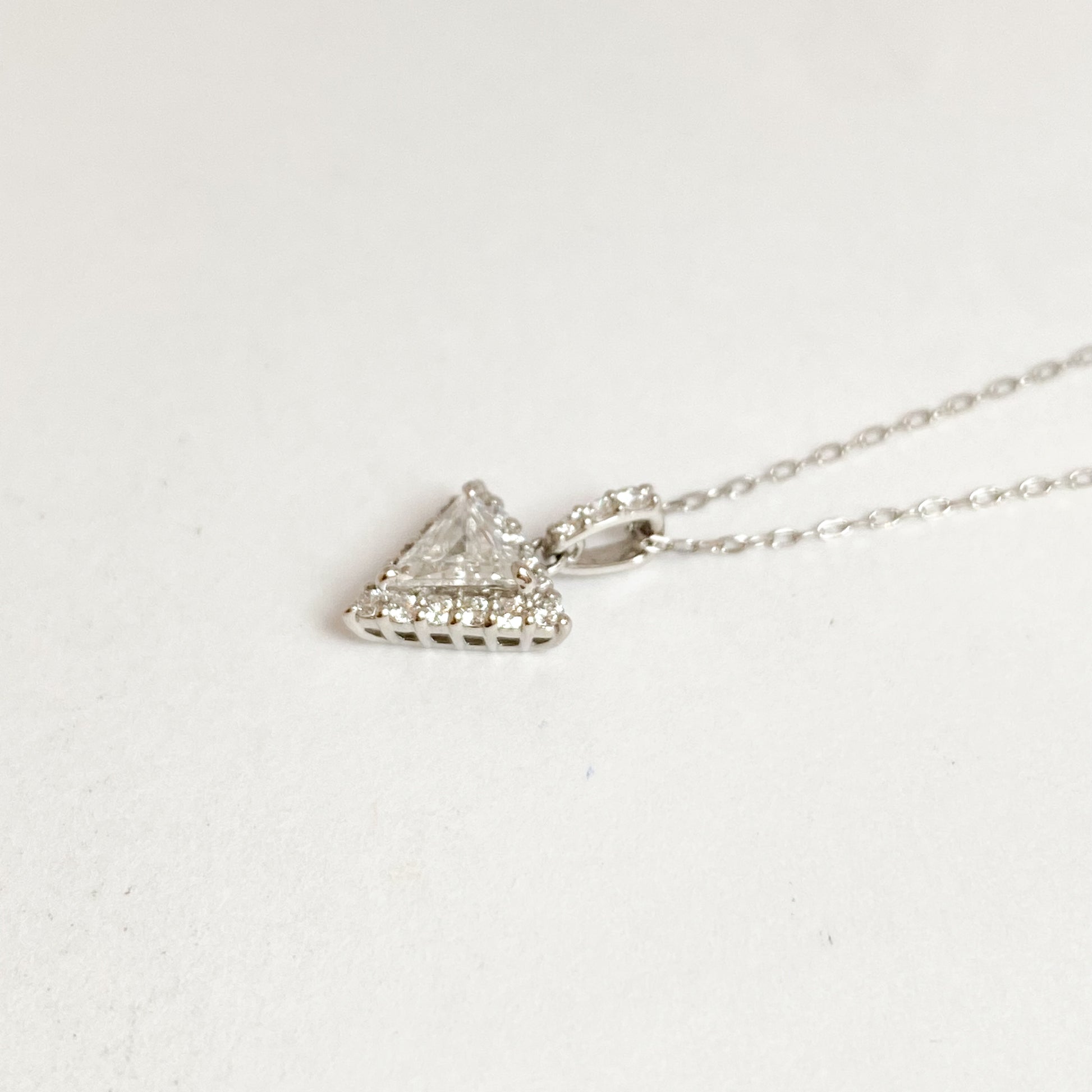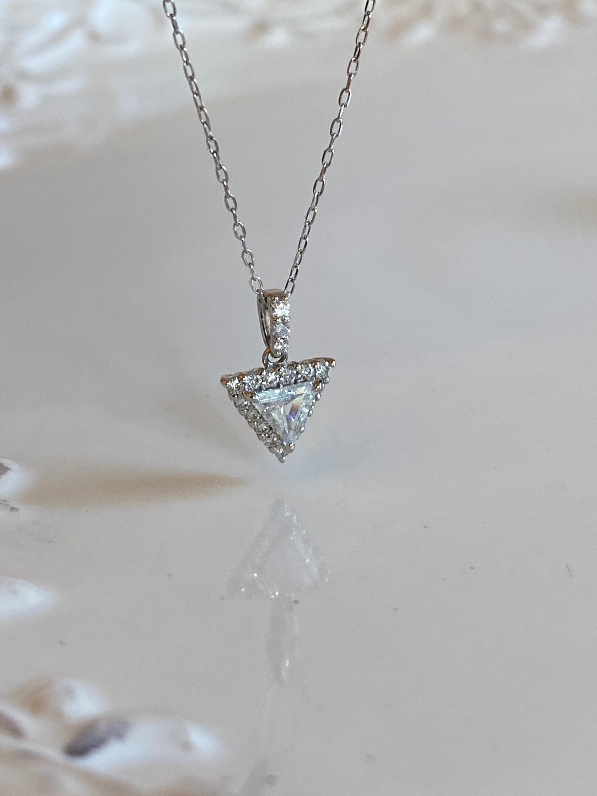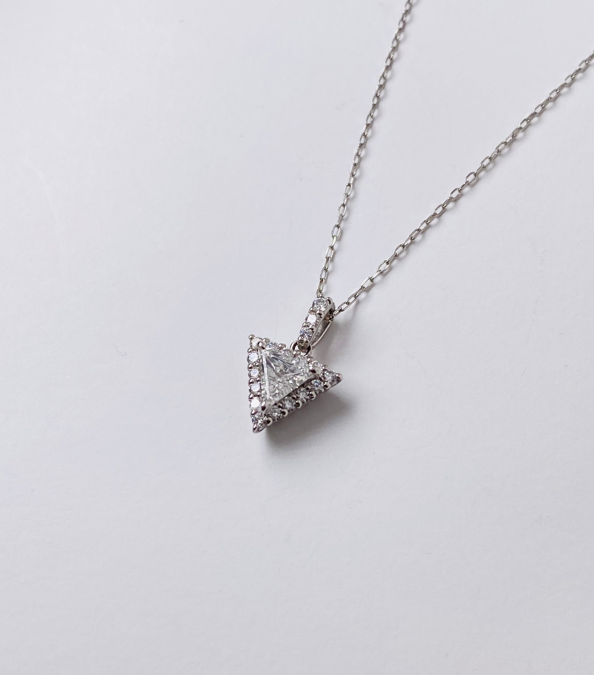 澄んだ輝きを放つトリリアントカットダイヤモンド(0.25ct)をセンターに、周囲をブリリアントカットのダイヤモンド(0.13ct)が繊細に囲んだネックレスです。
