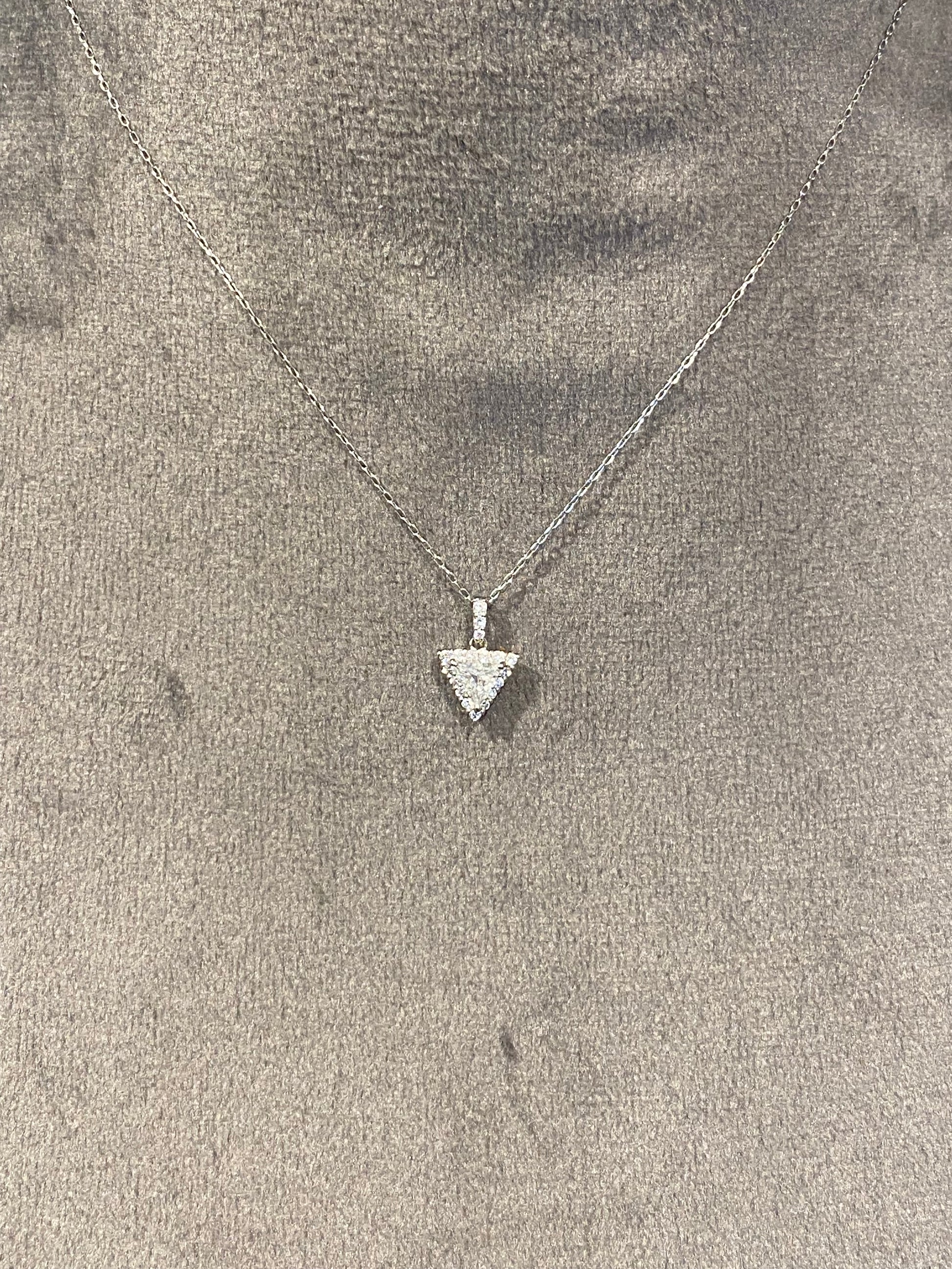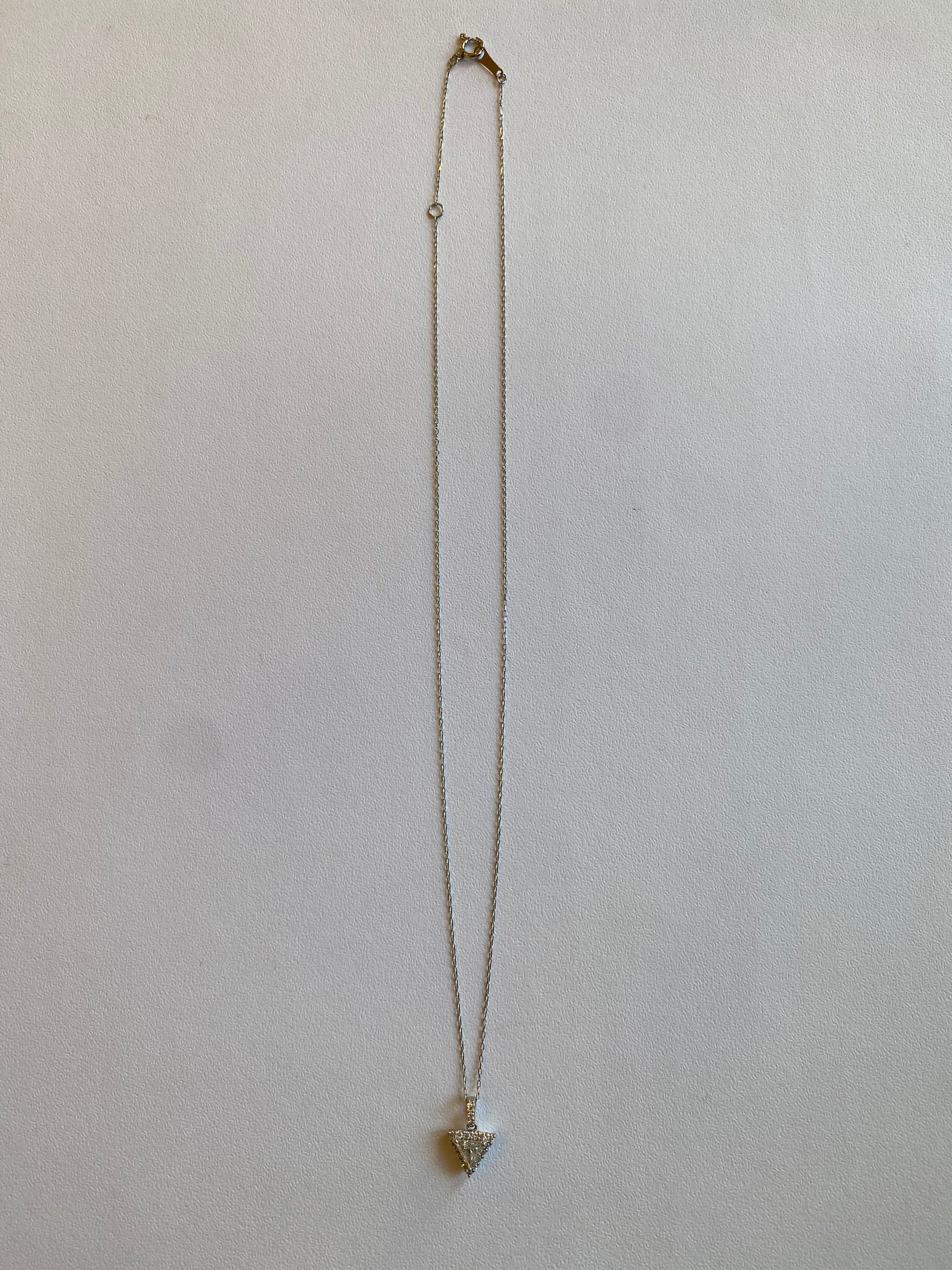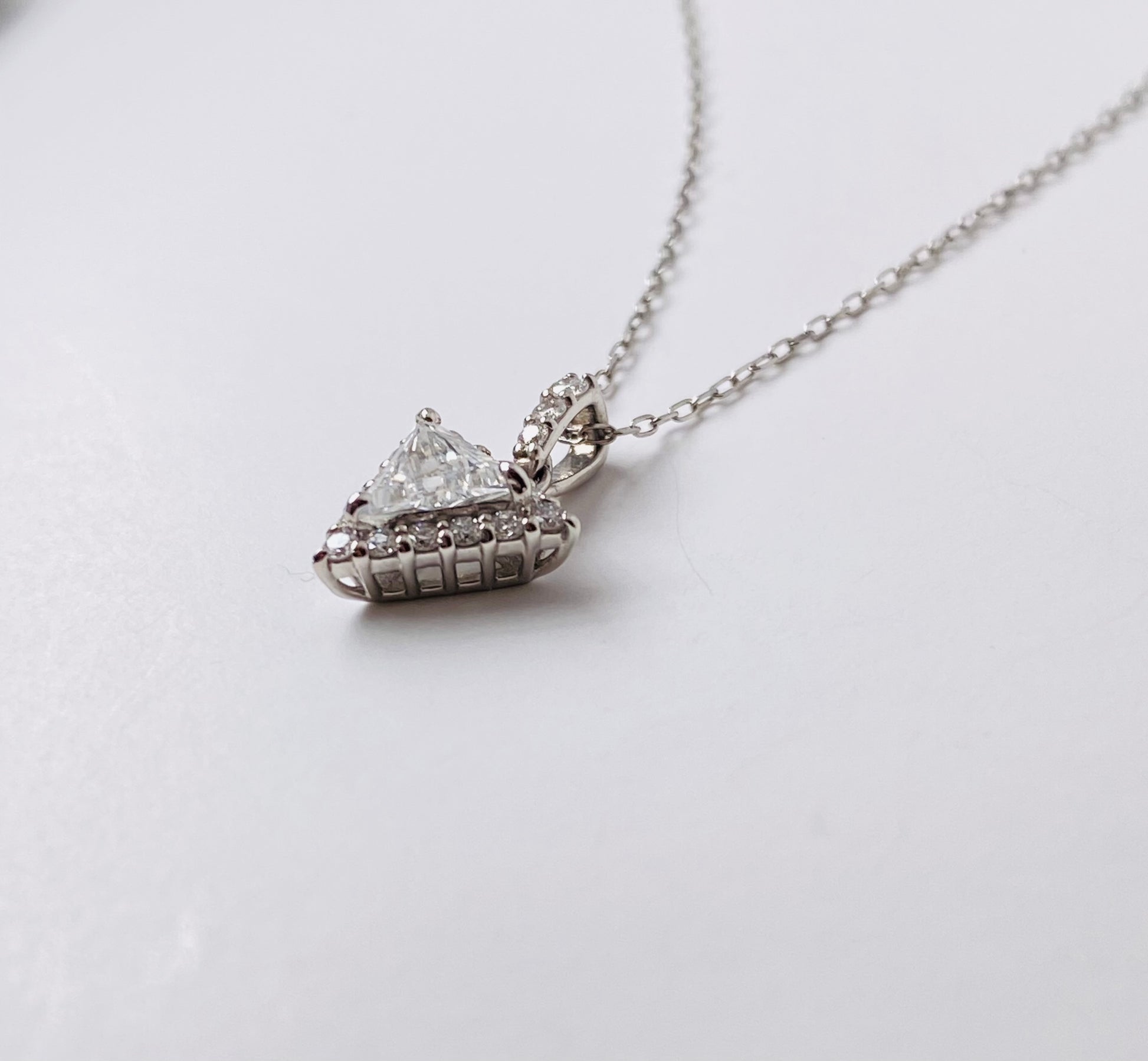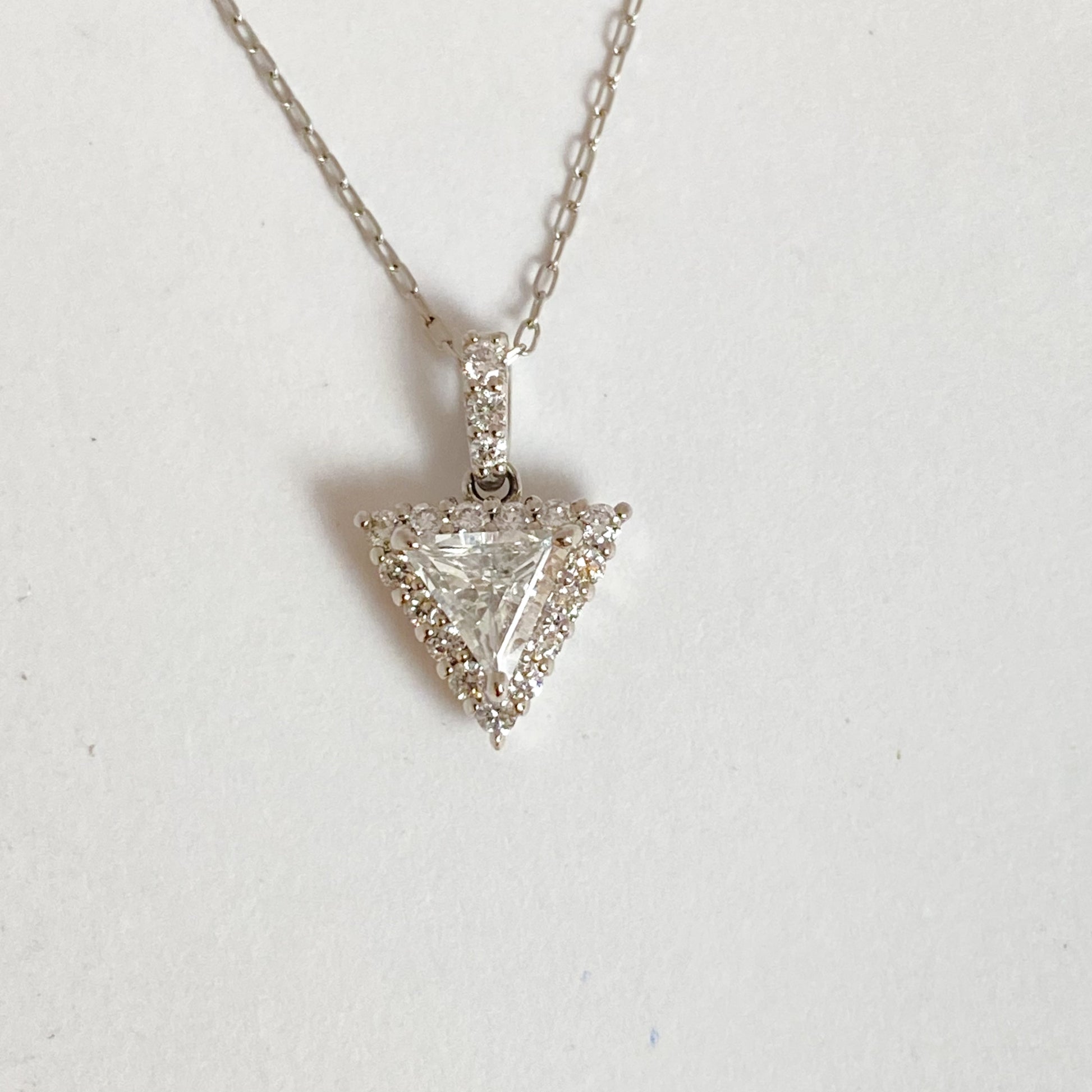 澄んだ輝きを放つトリリアントカットダイヤモンド(0.25ct)をセンターに、周囲をブリリアントカットのダイヤモンド(0.13ct)が繊細に囲んだネックレスです。