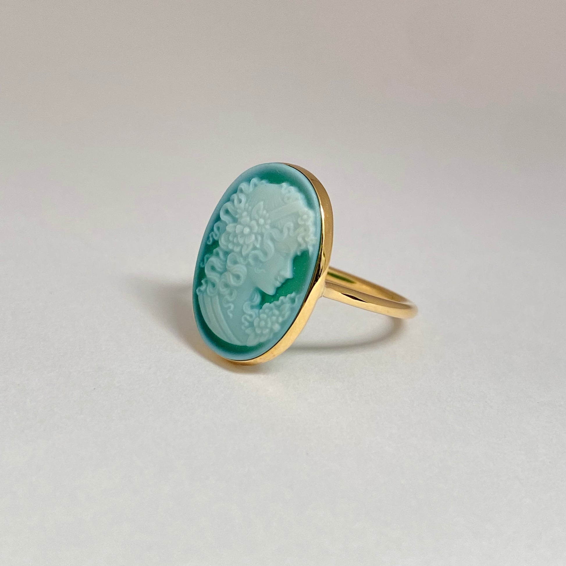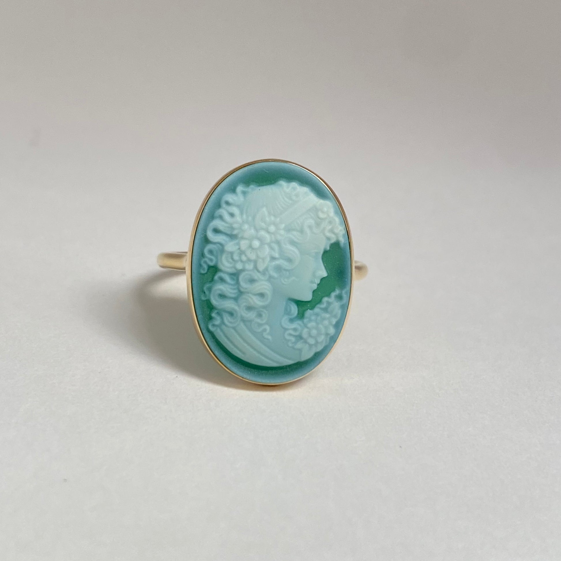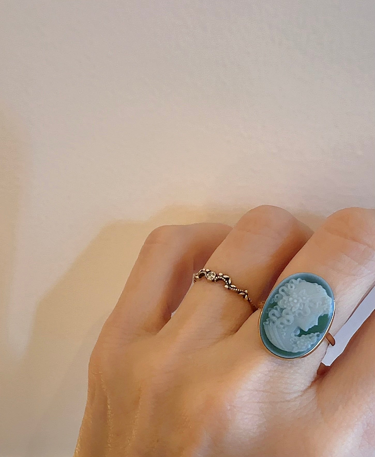 ミントブルーのガラスに白いレリーフが浮かぶ、