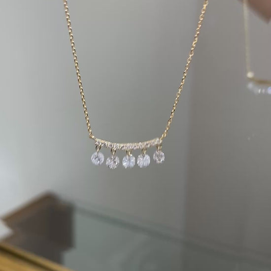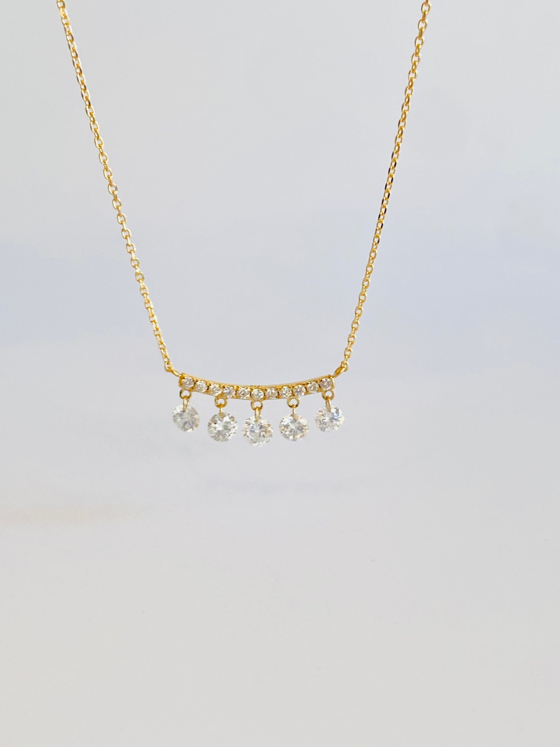 枠を使わずにセッティングしたトータル0.515ctのダイヤモンドは、光を受けるたびに軽やかに揺れ、透明感のある輝きを放ちます。バー部分には0.085ctのメレダイヤをセッティングしています。