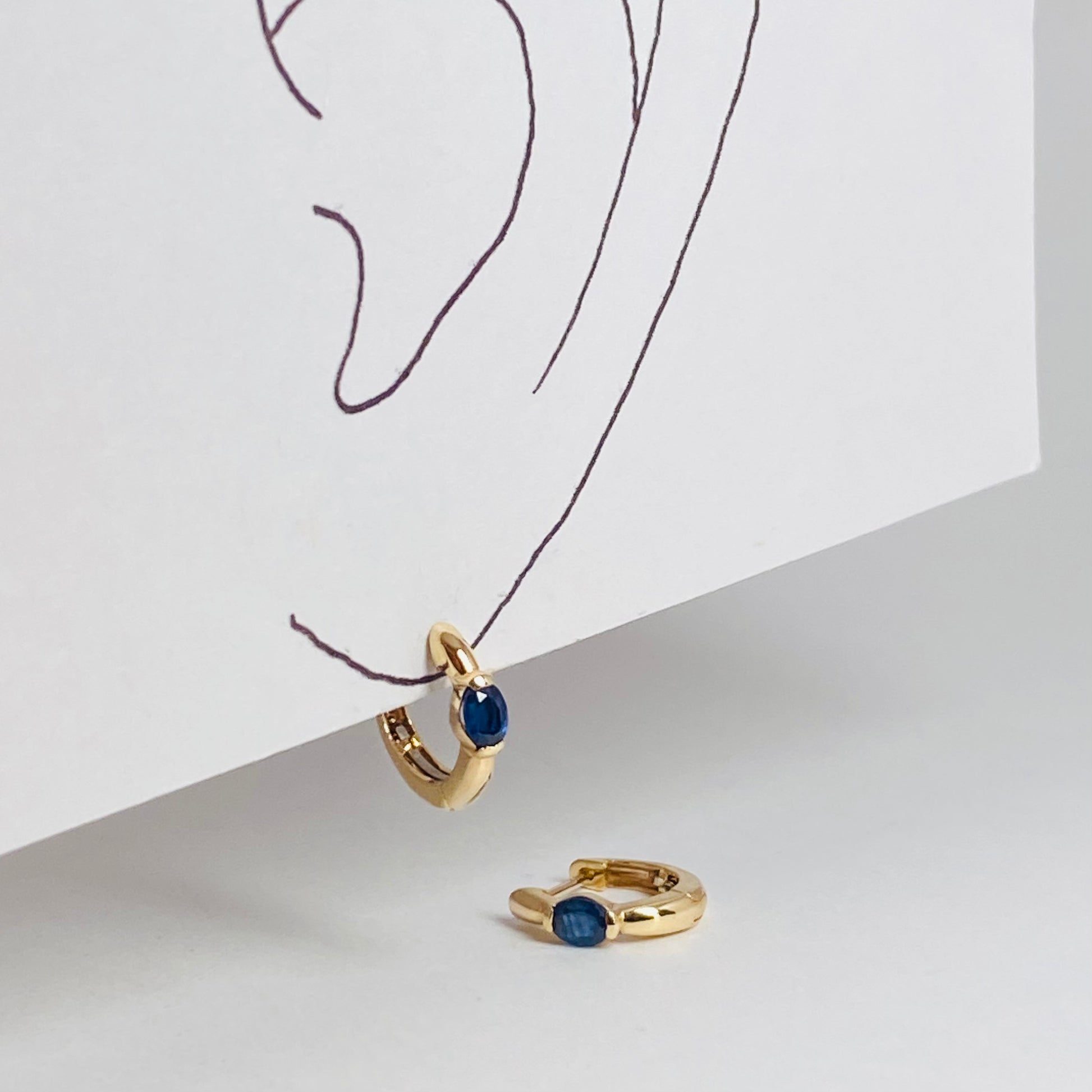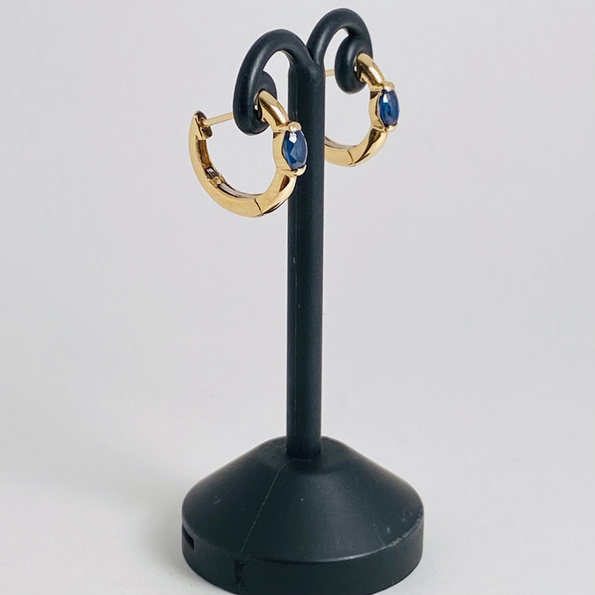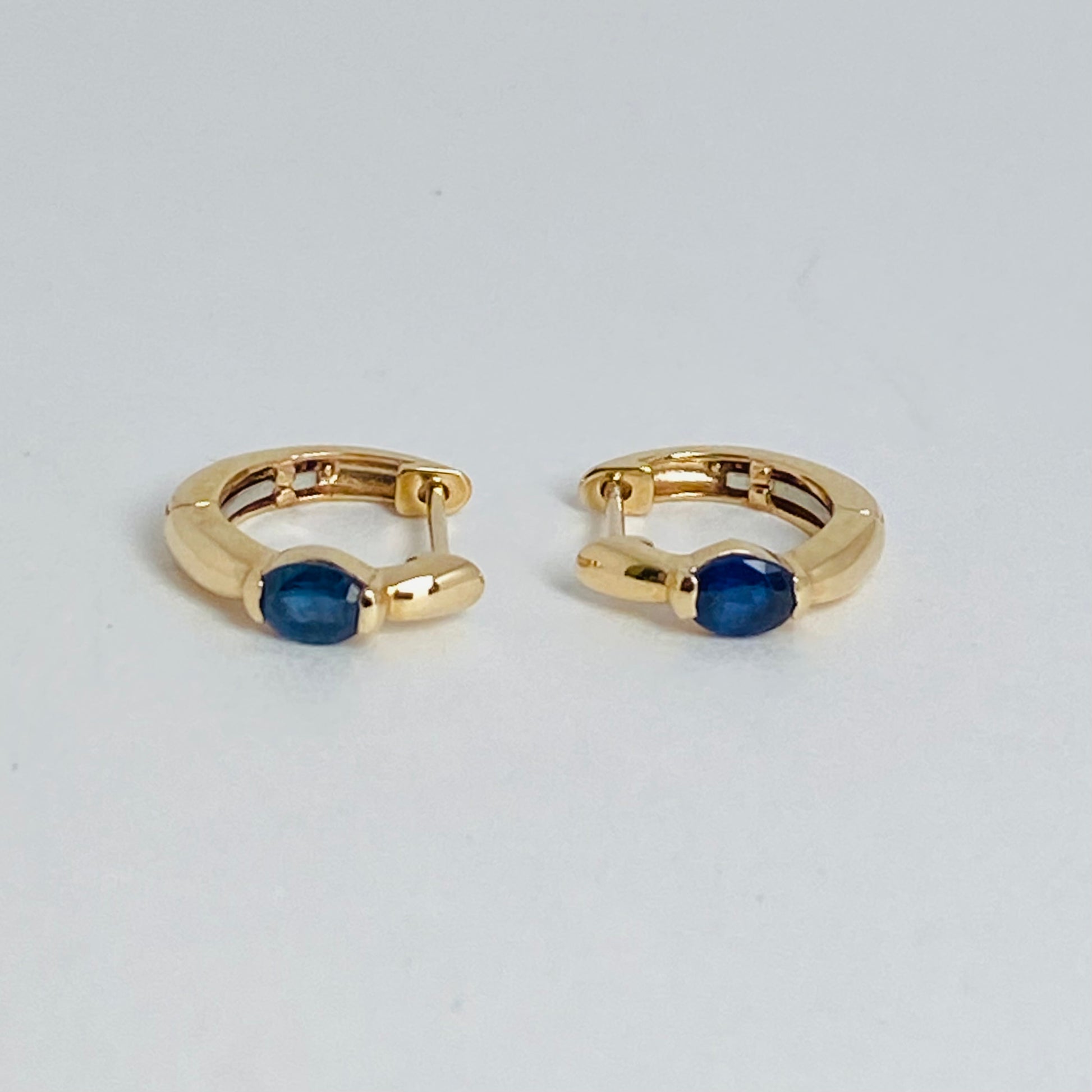 深みのあるブルーサファイアをワンポイントにセッティングしたK10イエローゴールドの中折れフープピアスです。