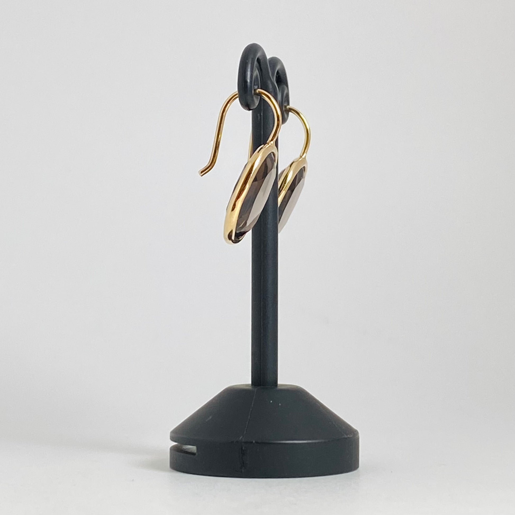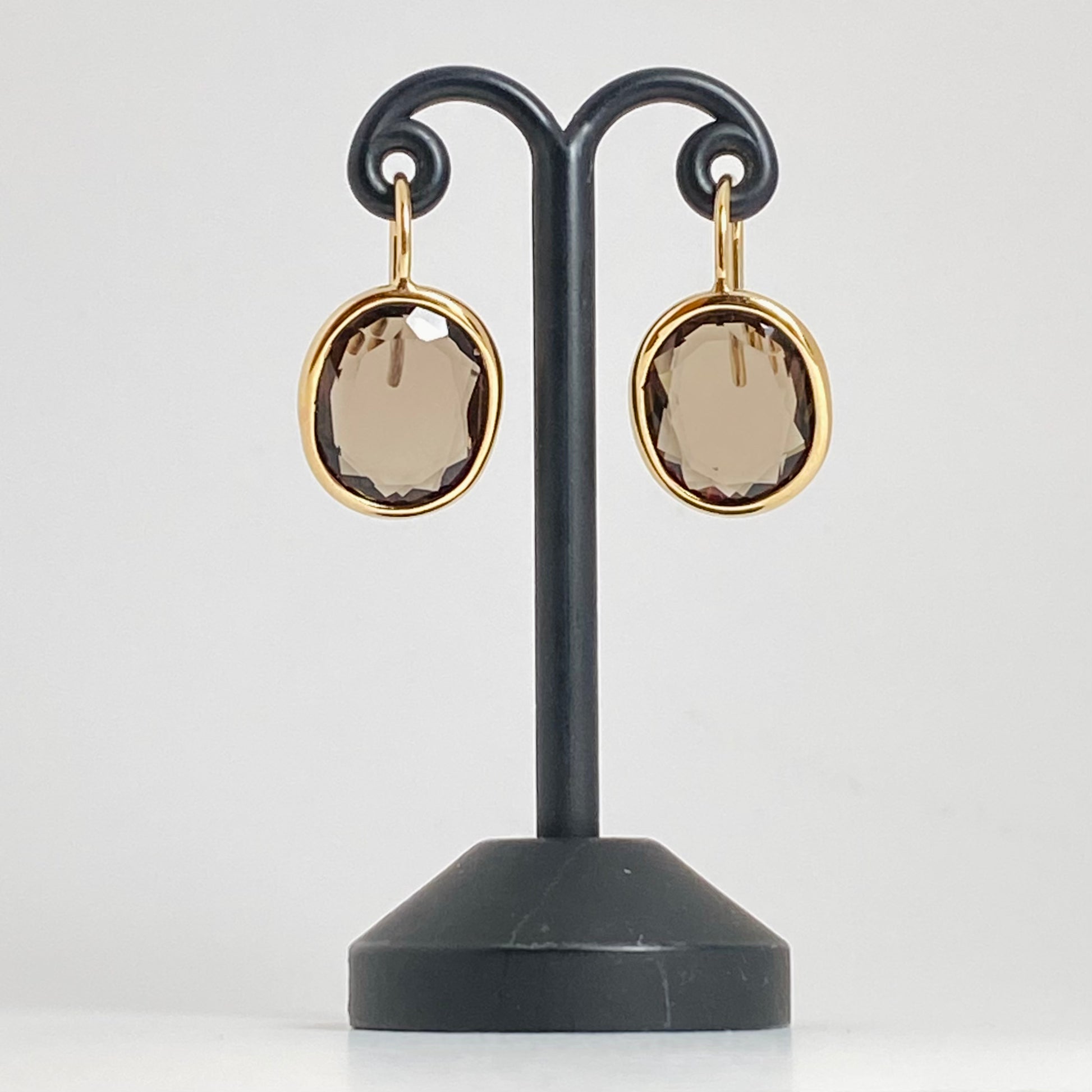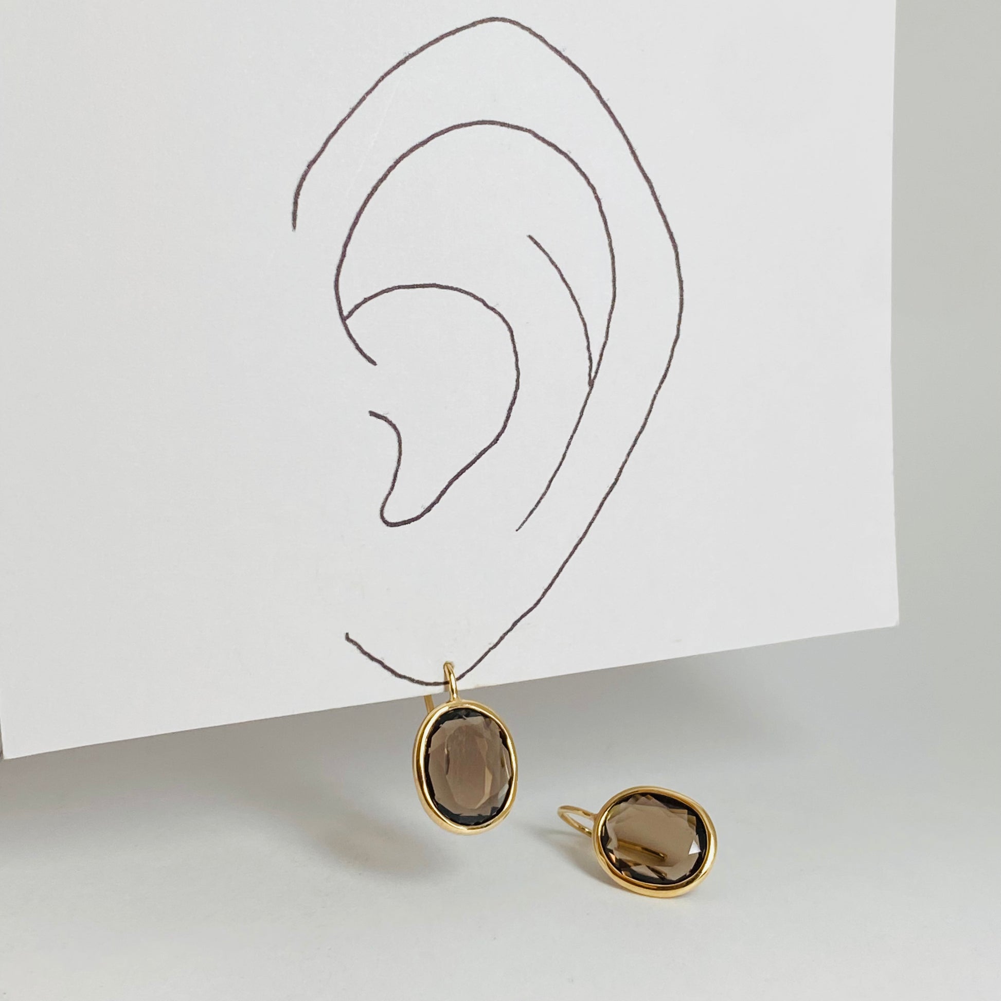 オーバルカットのクォーツをイエローゴールドのフレームで丁寧に囲み、揺れずに耳もとに静かに寄り添うデザイン。
