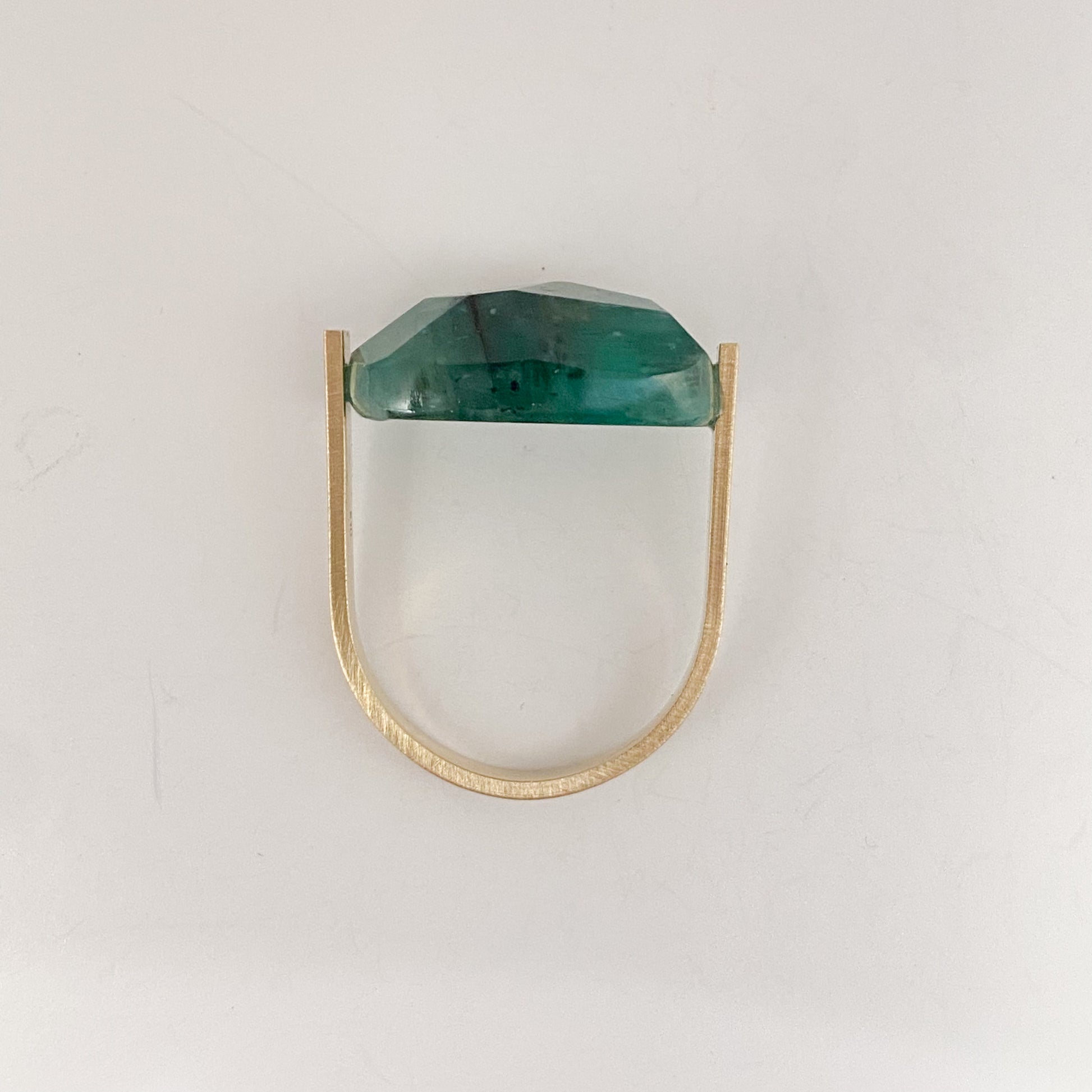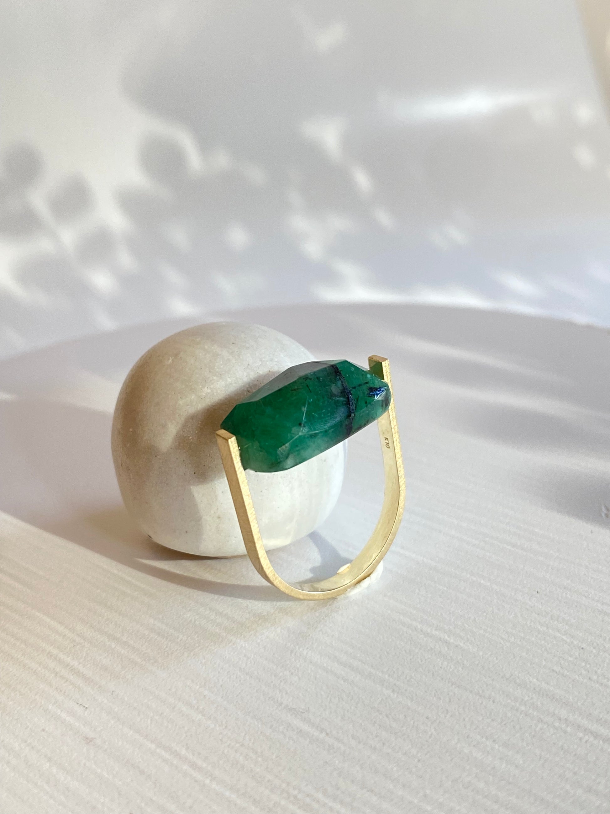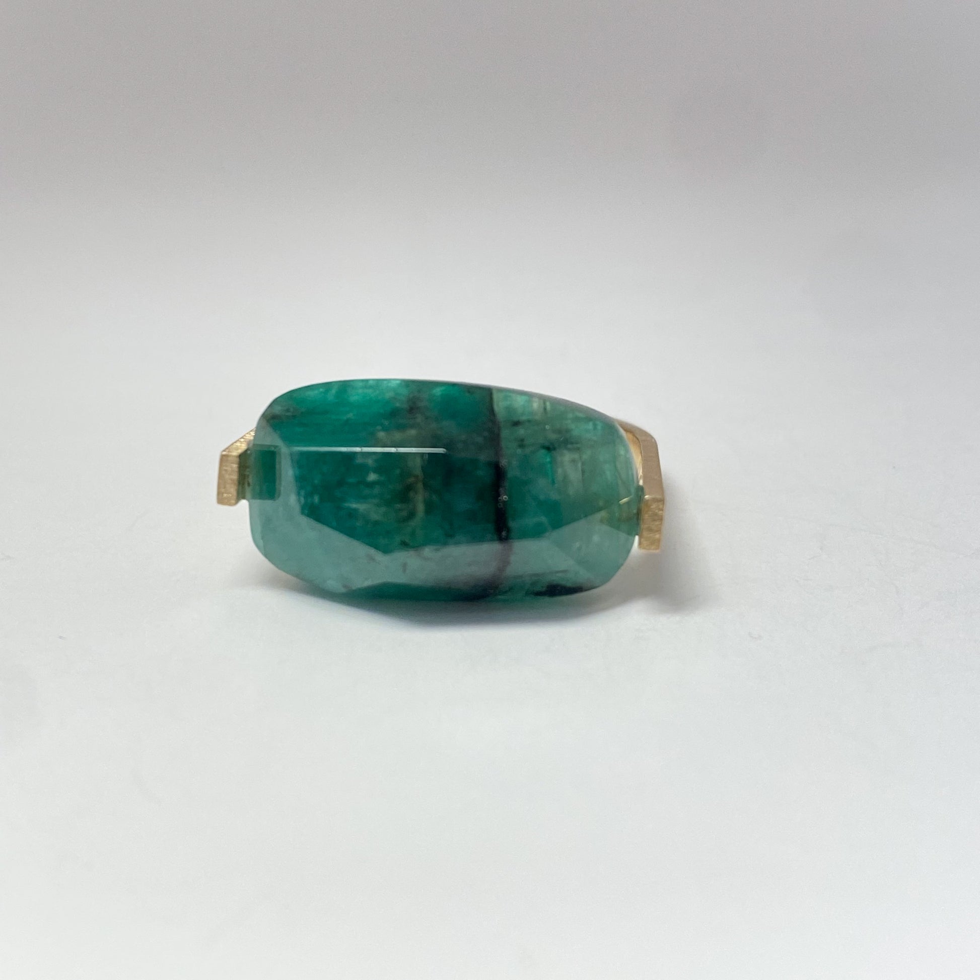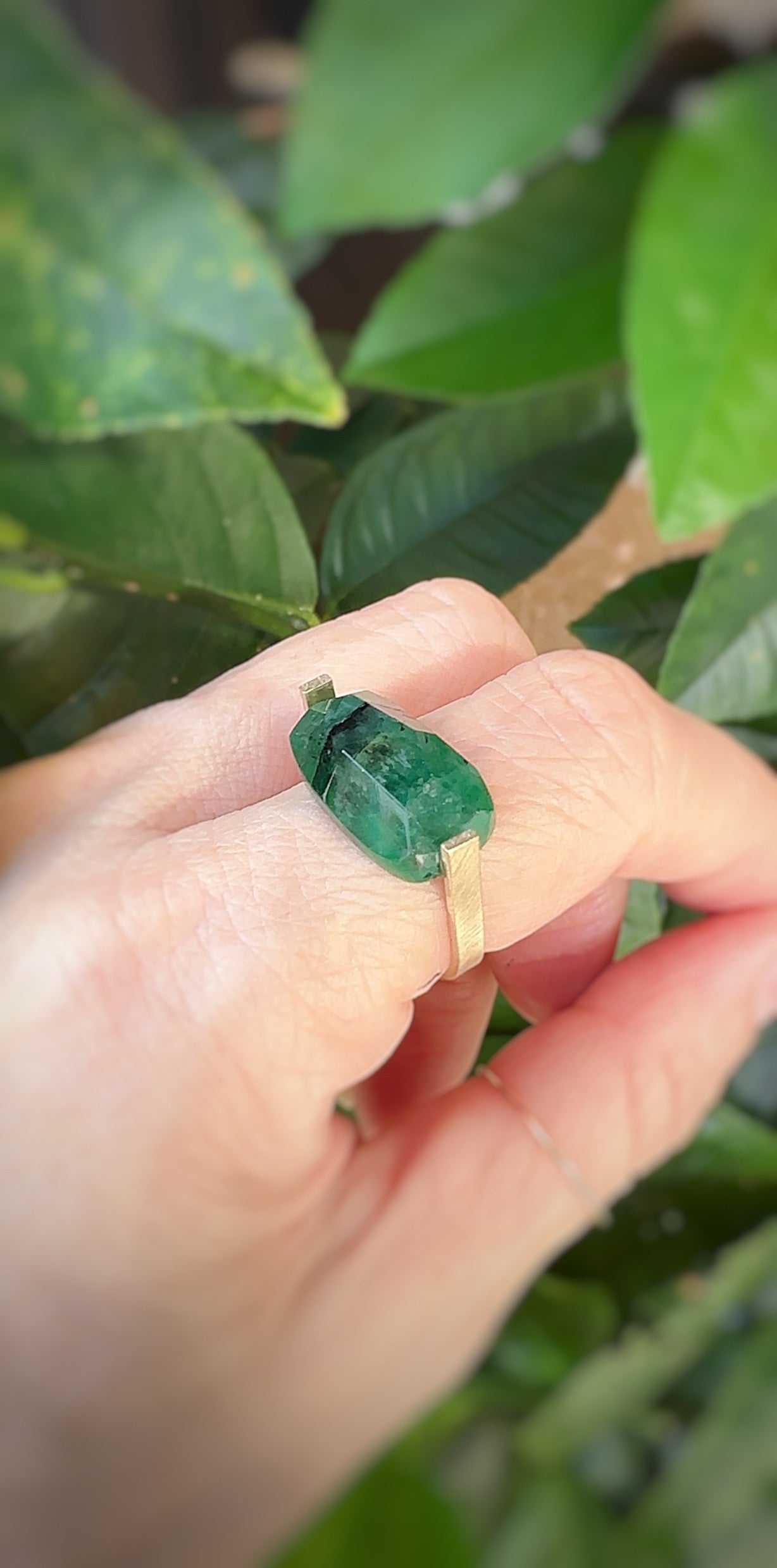 K10イエローゴールドに、エメラルドの原石をカットした一点物のリングです。