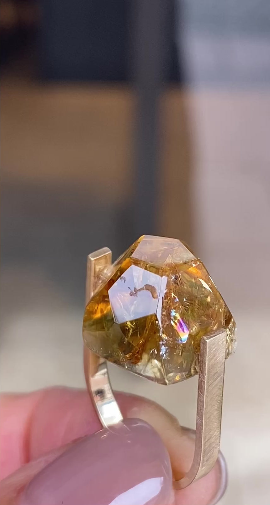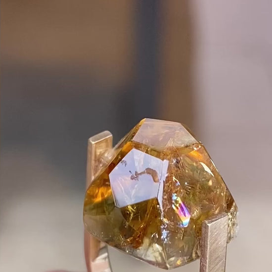 内包されたクラックが生み出す表情がとても印象的な、 オリジナルのシトリンリングです。石の内部に走るクラックが光を反射し、角度によって横にレインボーが現れます。