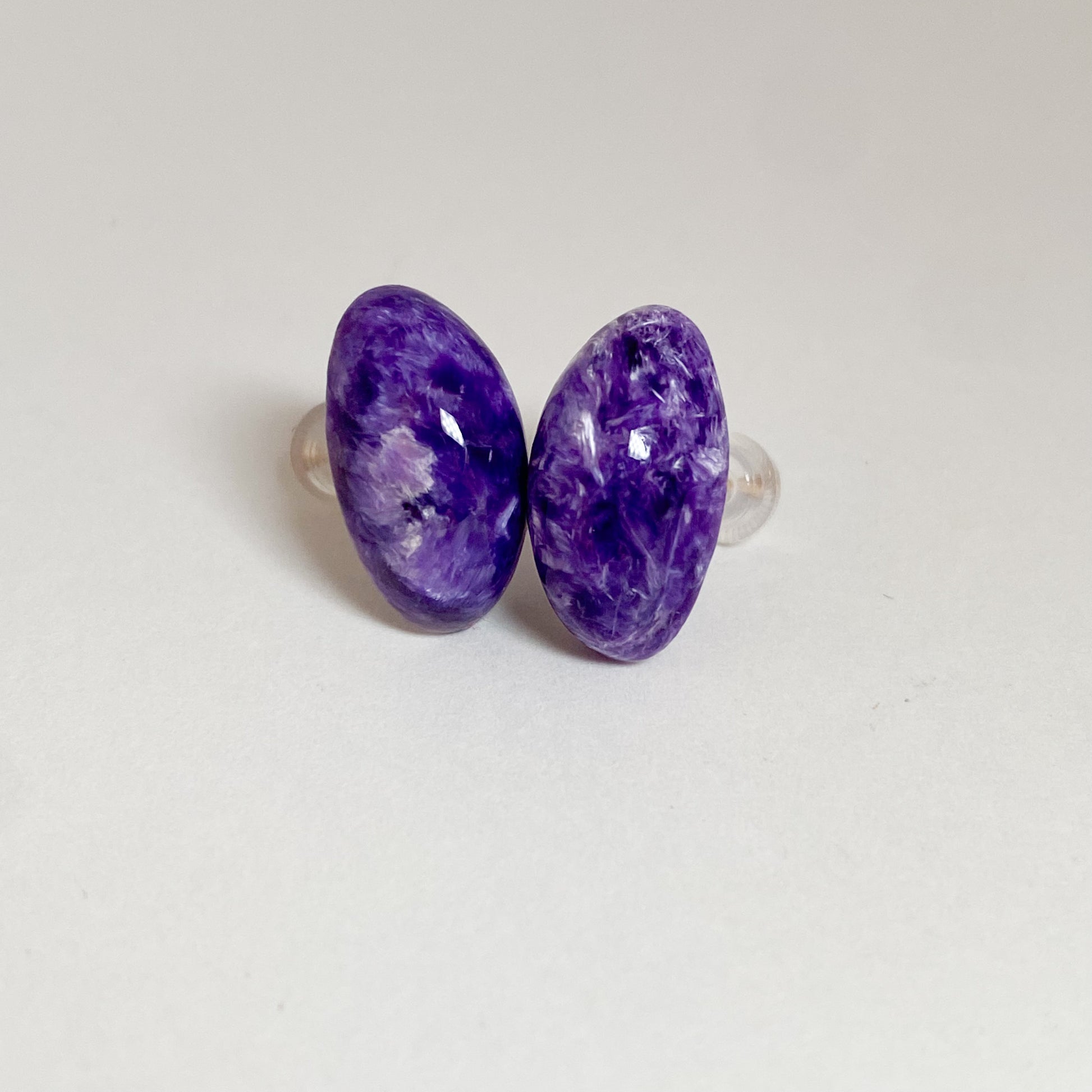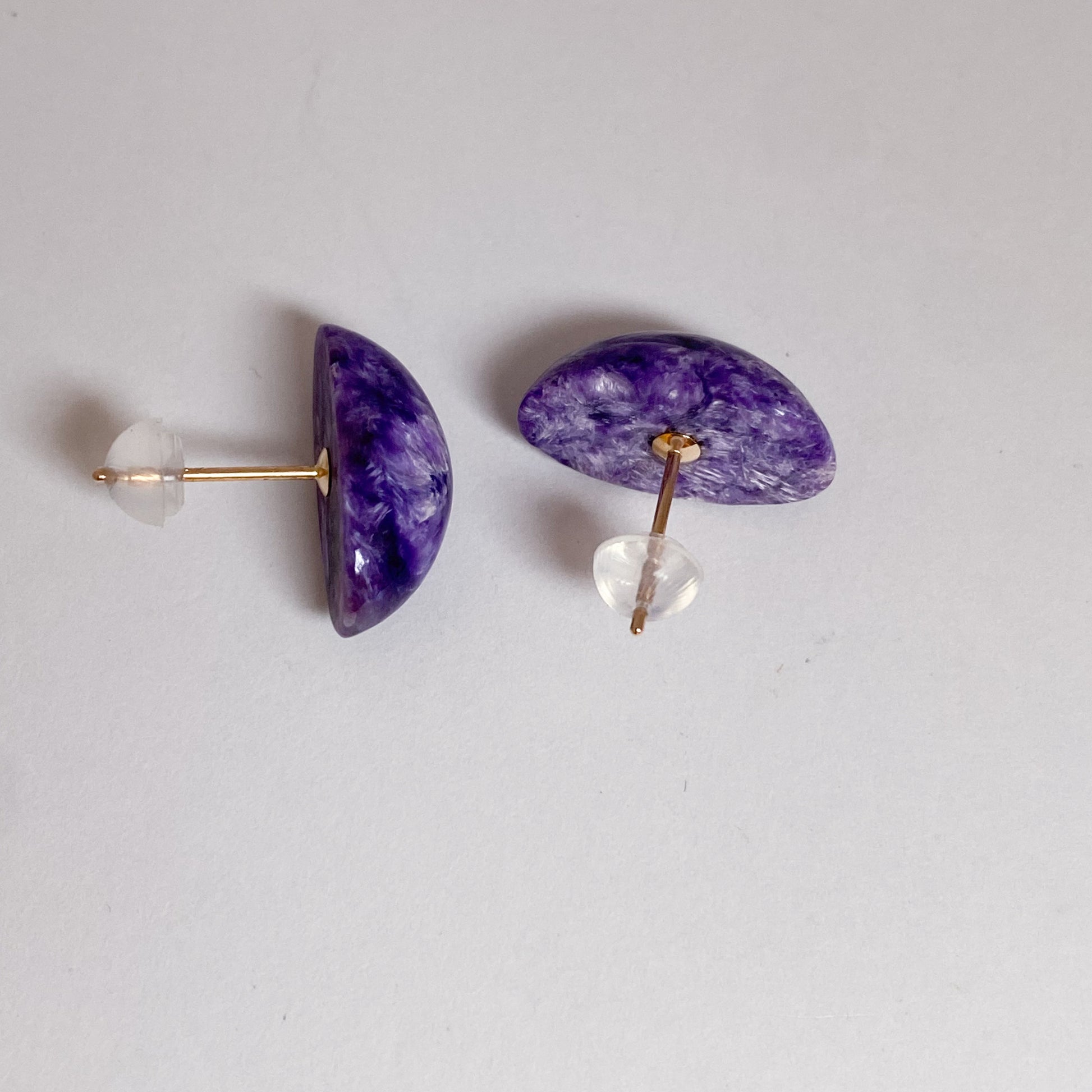 深みのある紫が印象的なチャロアイトを使用した、存在感のあるスタッドピアスです。