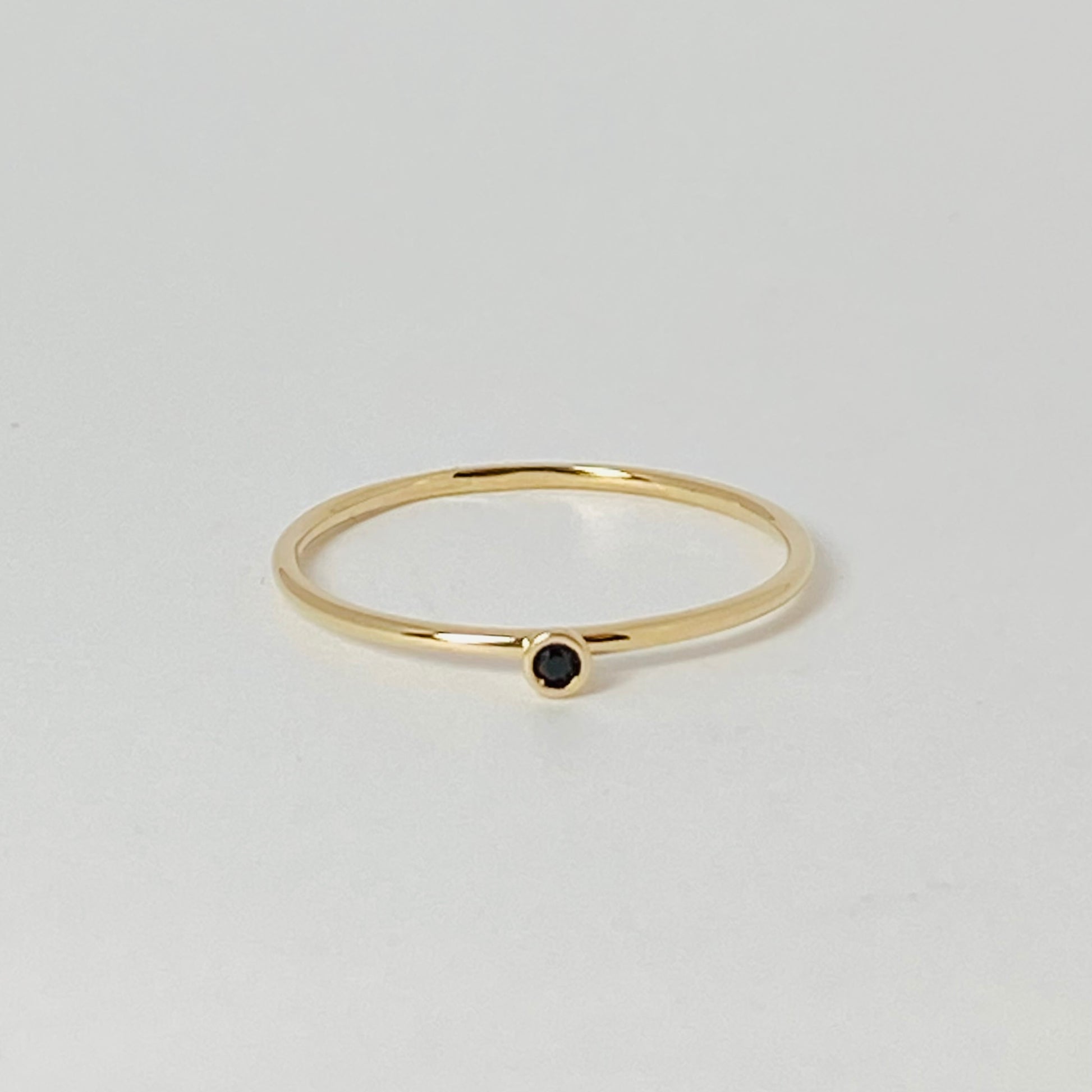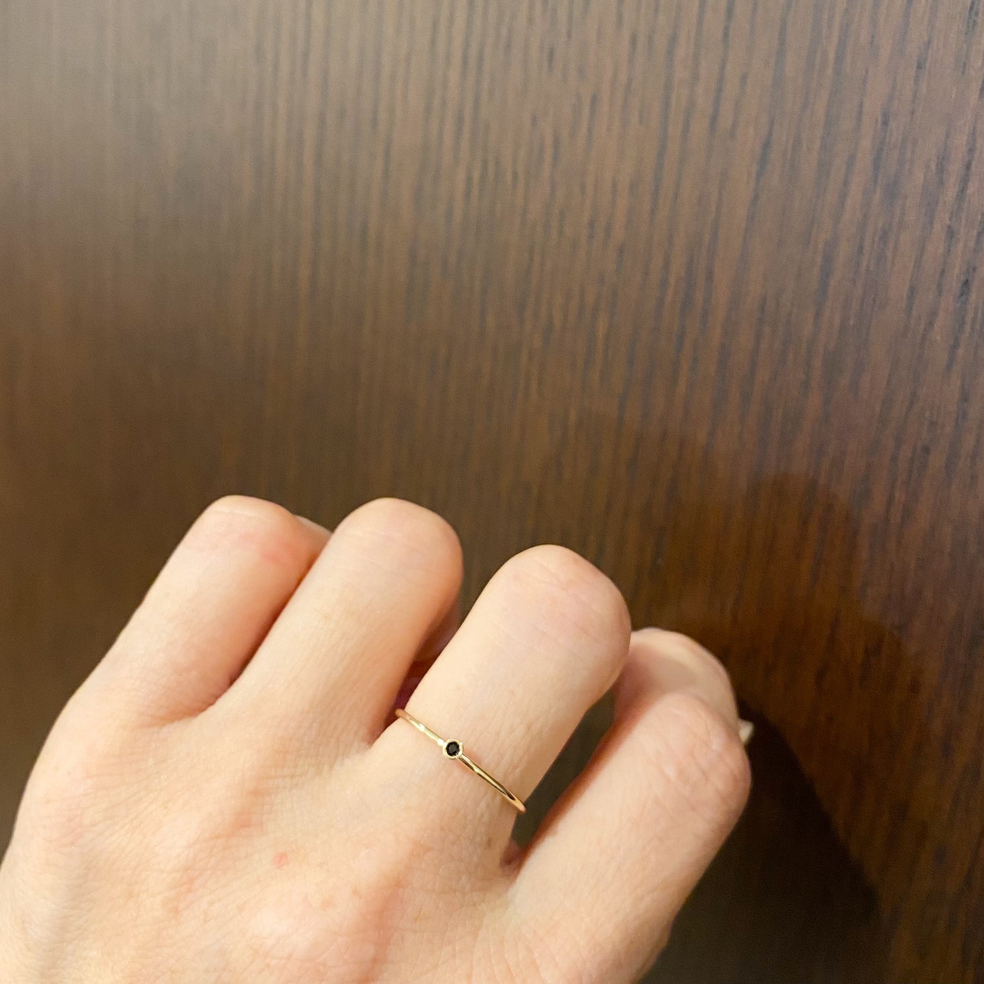 小さなブラックスピネルが指先でさりげなく輝く、K10イエローゴールドの華奢リングです。