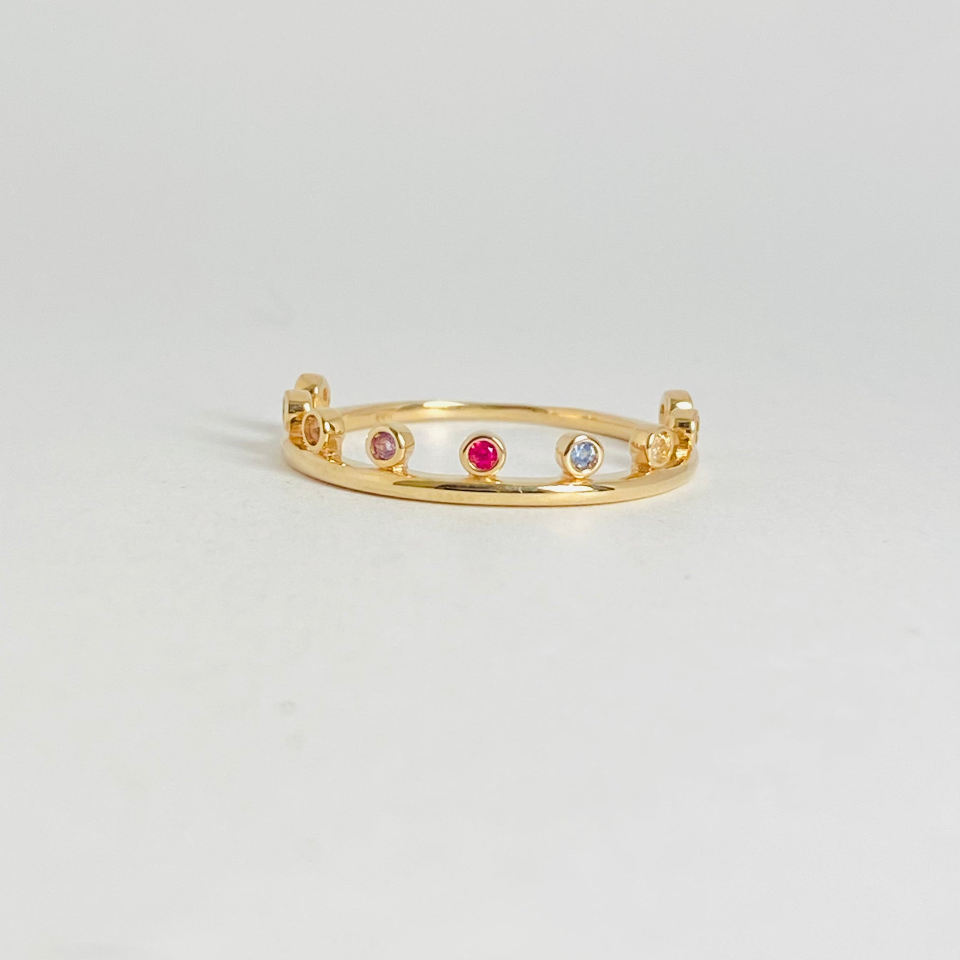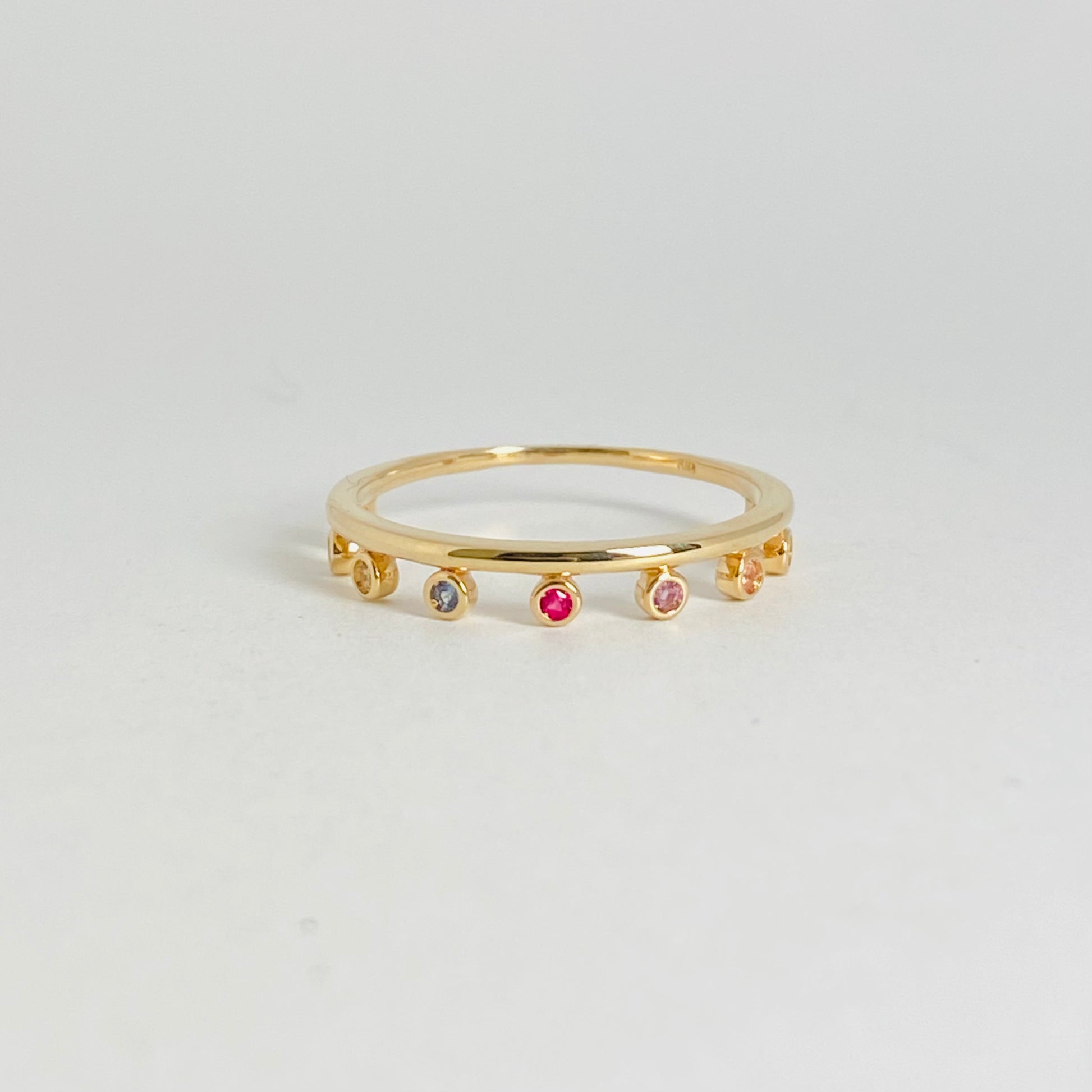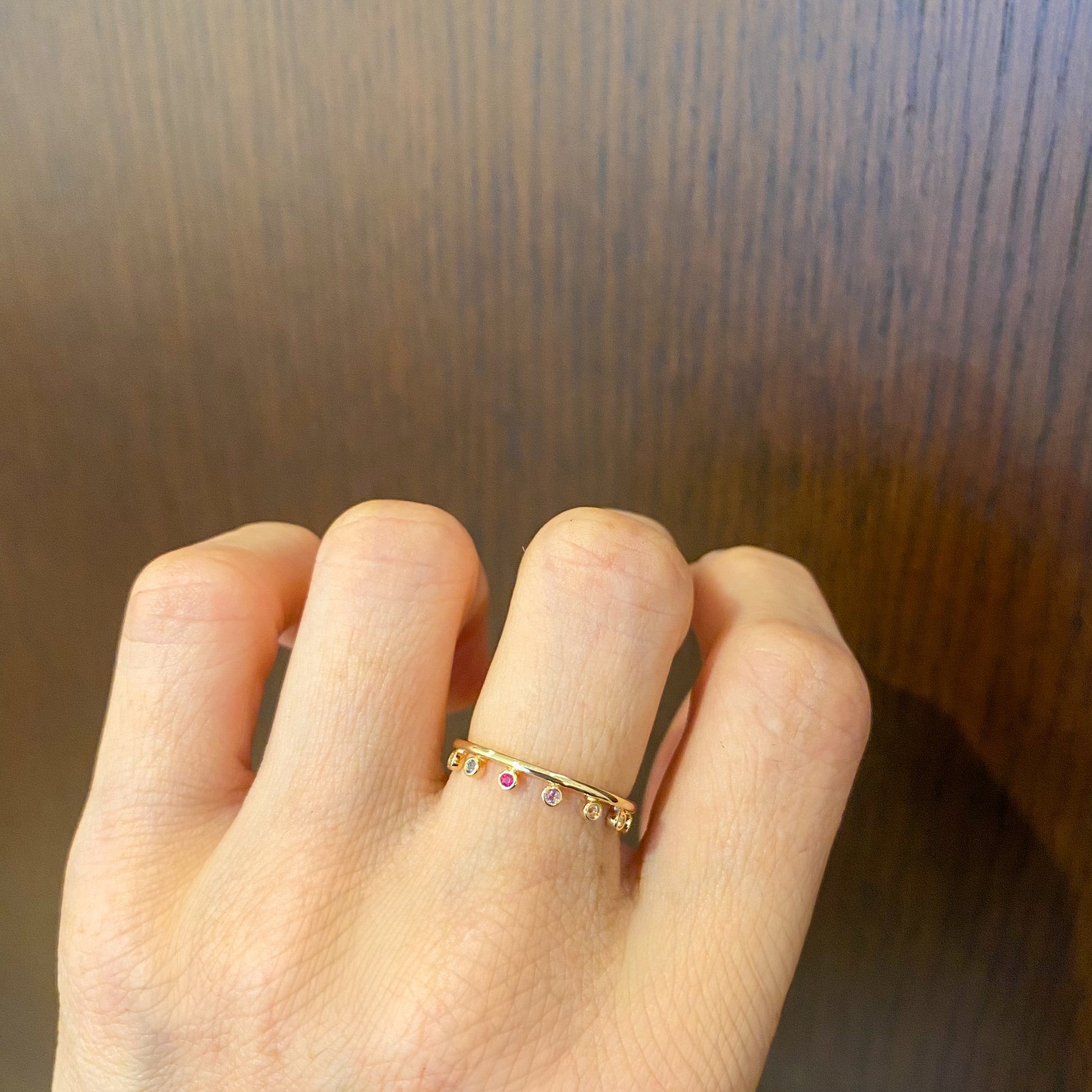 ルビー、サファイア、淡いカラーの天然石をリズミカルに並べた可憐なリングです。
