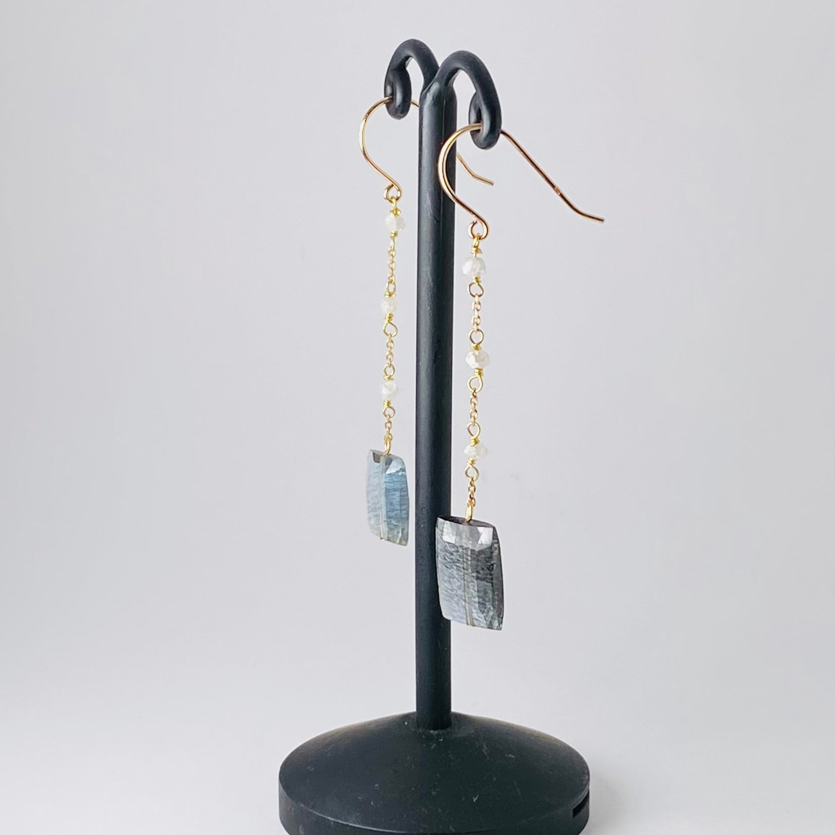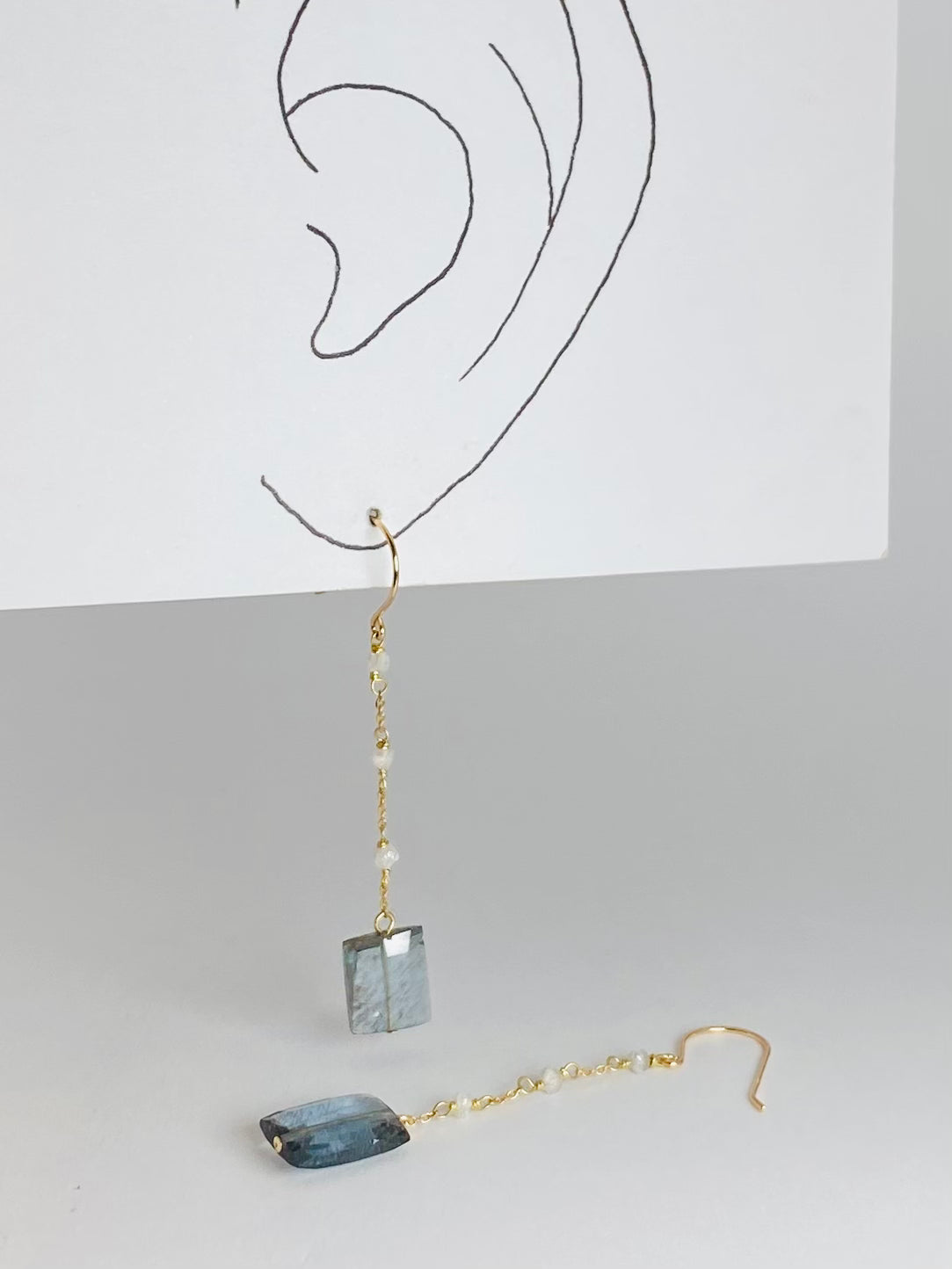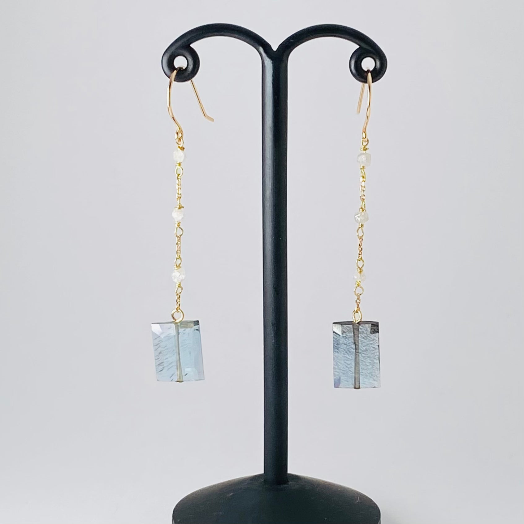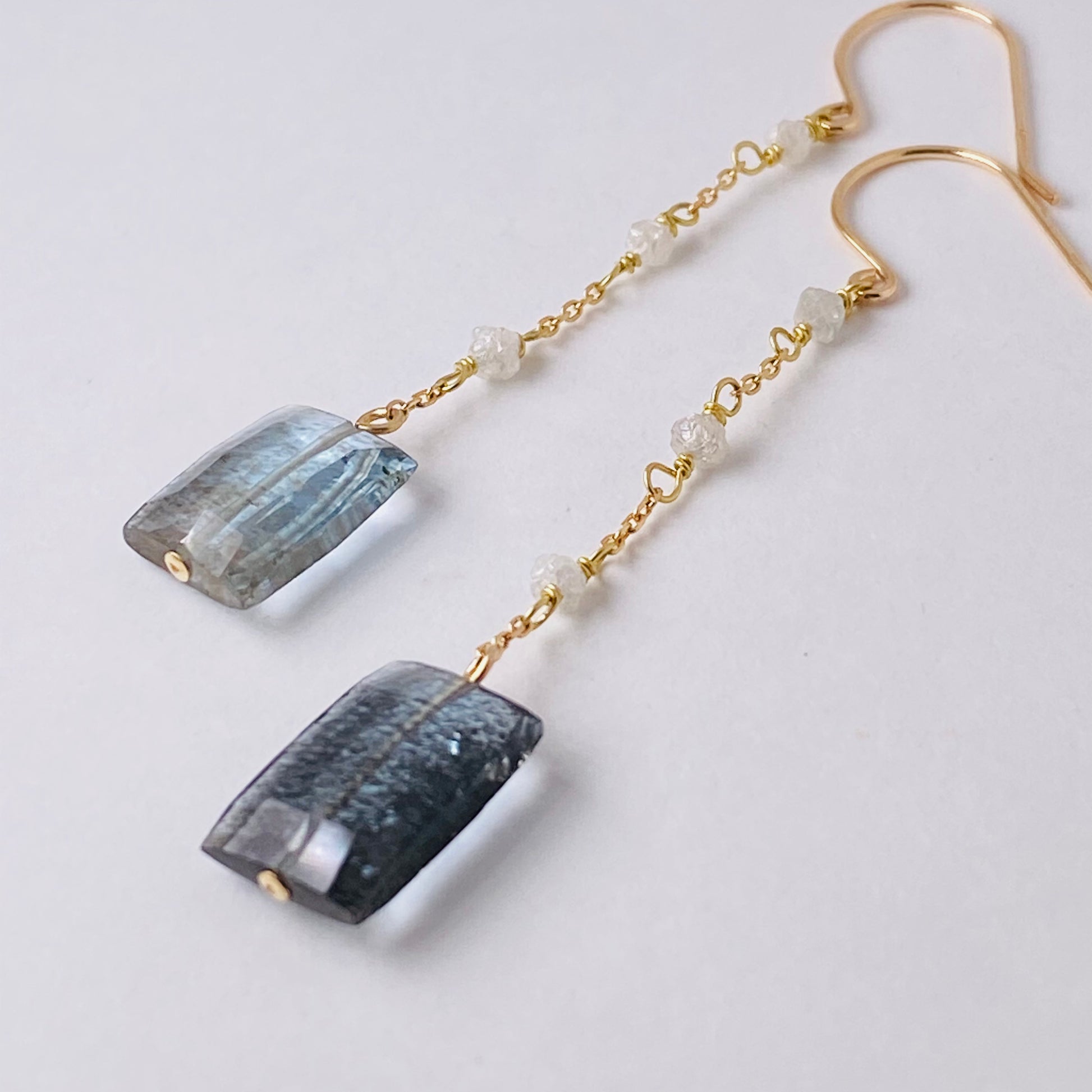 自然の静かさと深みを感じるブルーグレーの幻想的なモスアクアマリンをダイヤモンドの原石でつなげたピアスです。