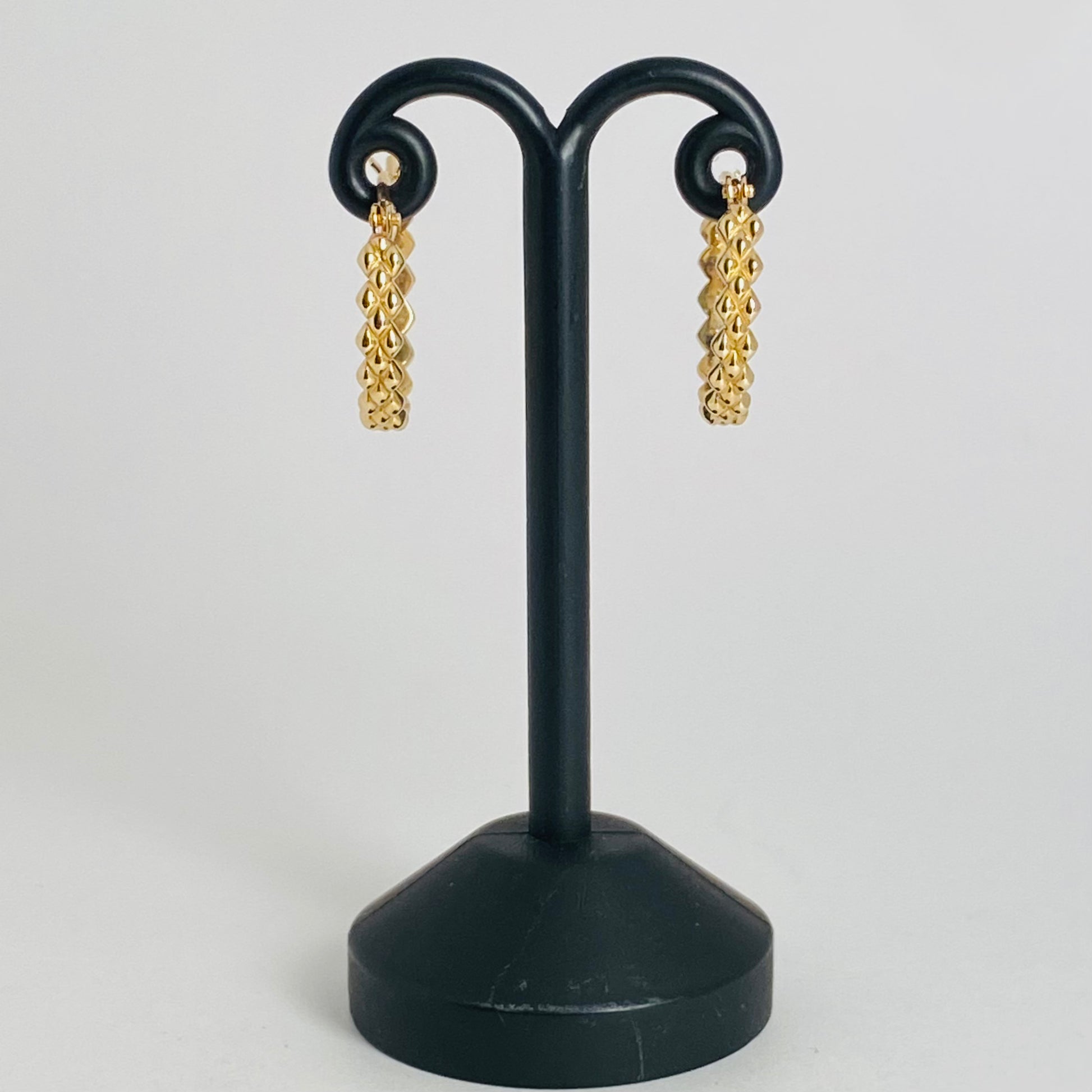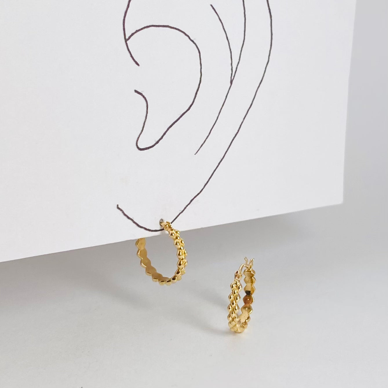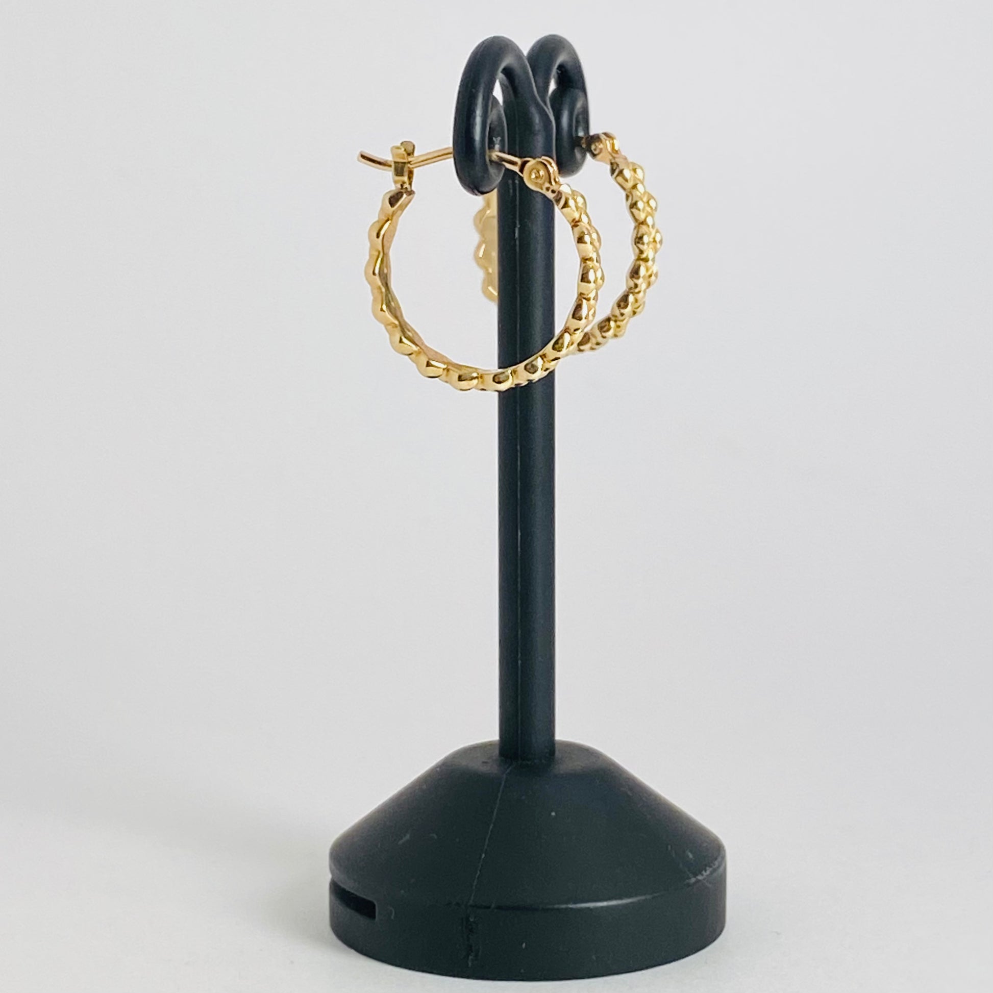 K10イエローゴールドのフープに、小さなドットを連ねたような立体模様のフープピアスです。