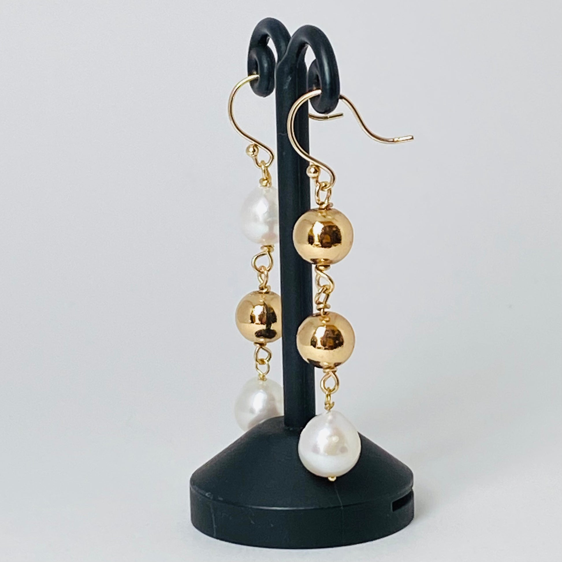 淡水パールと金色のヘマタイトが連なり揺れるピアスです。