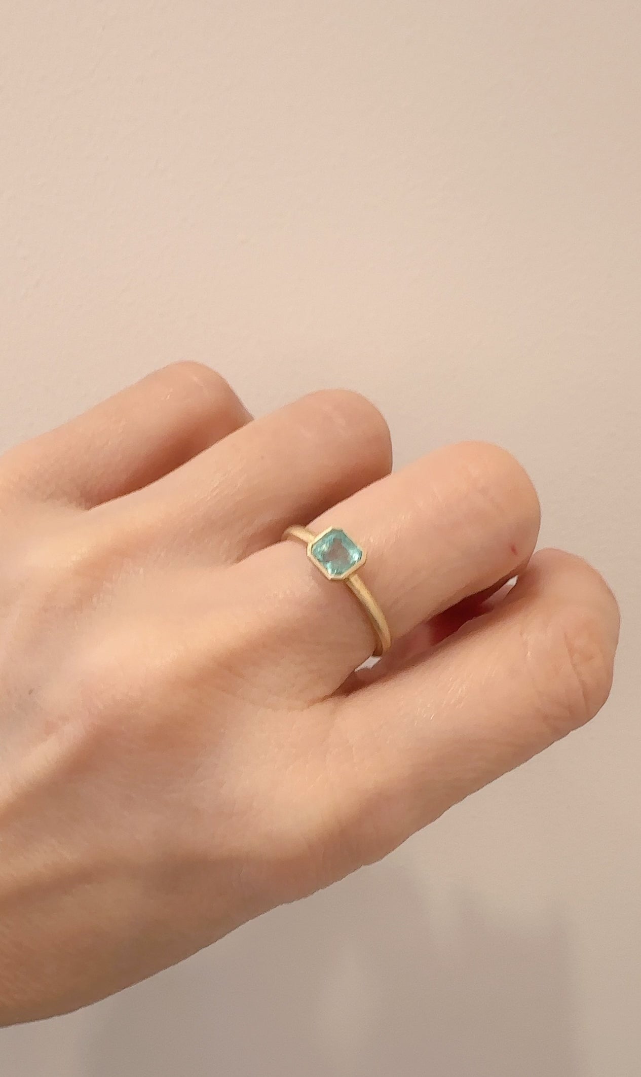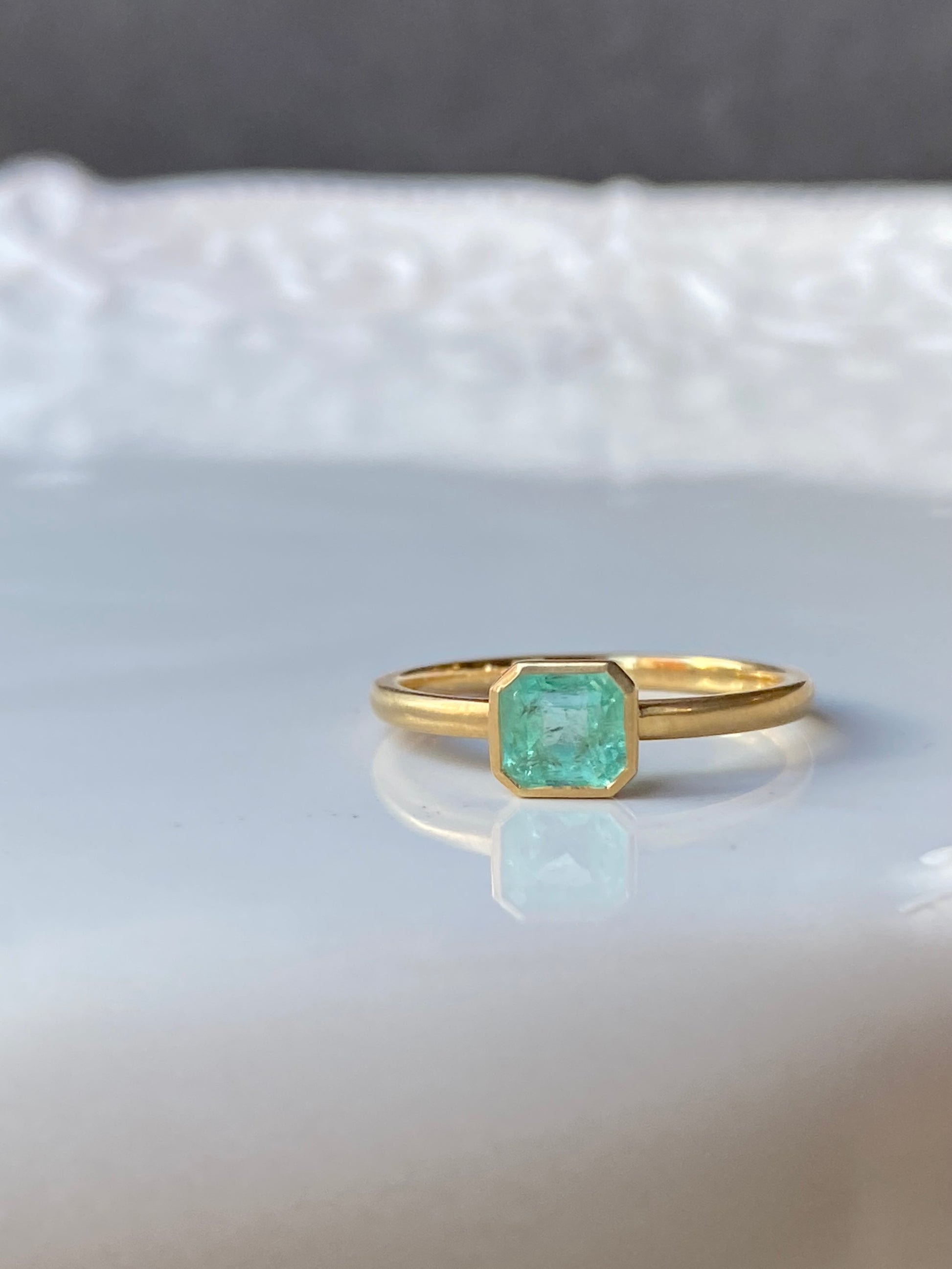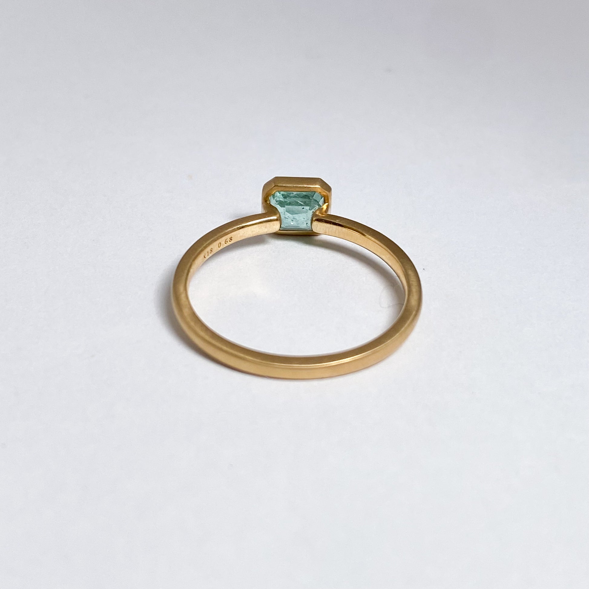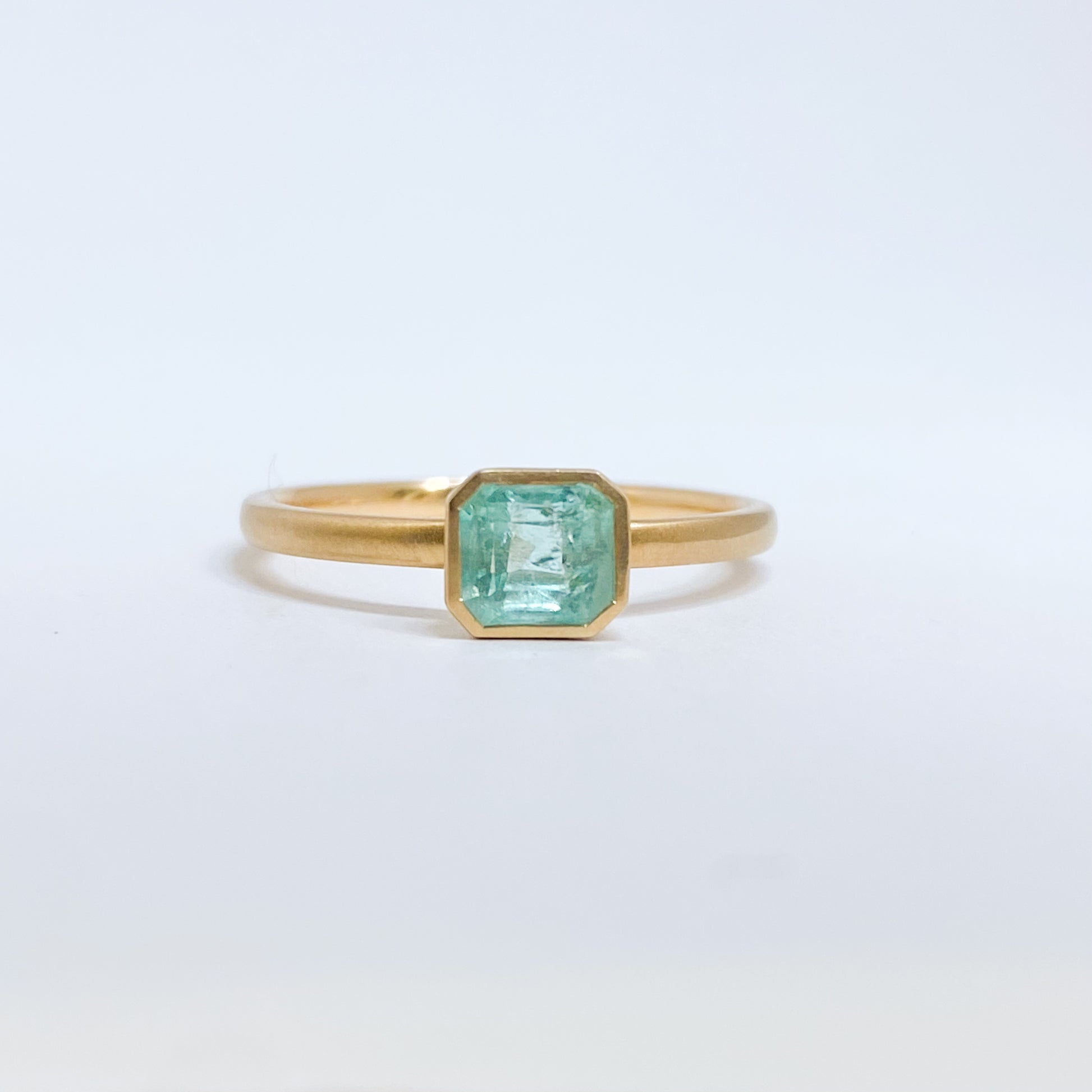 淡くやさしい色合いのエメラルドを、マット仕上げのゴールドに合わせたシンプルなリングです。