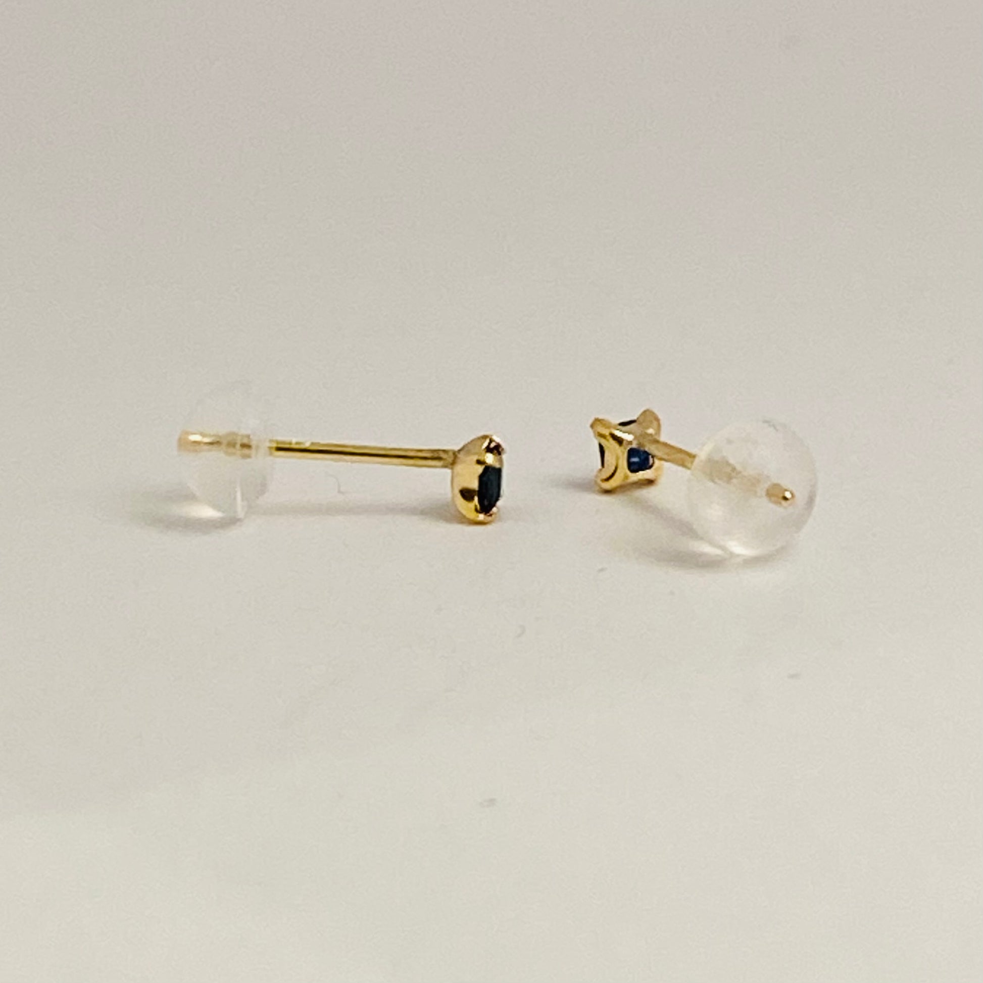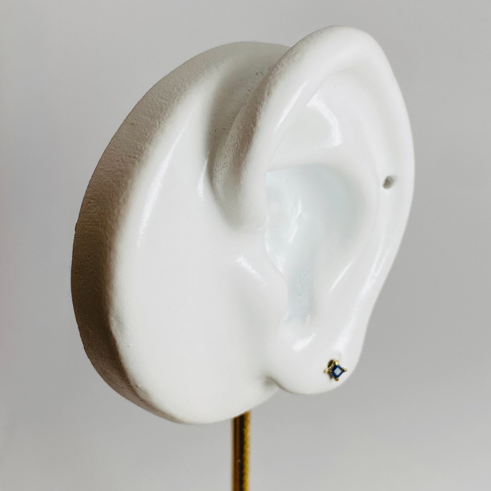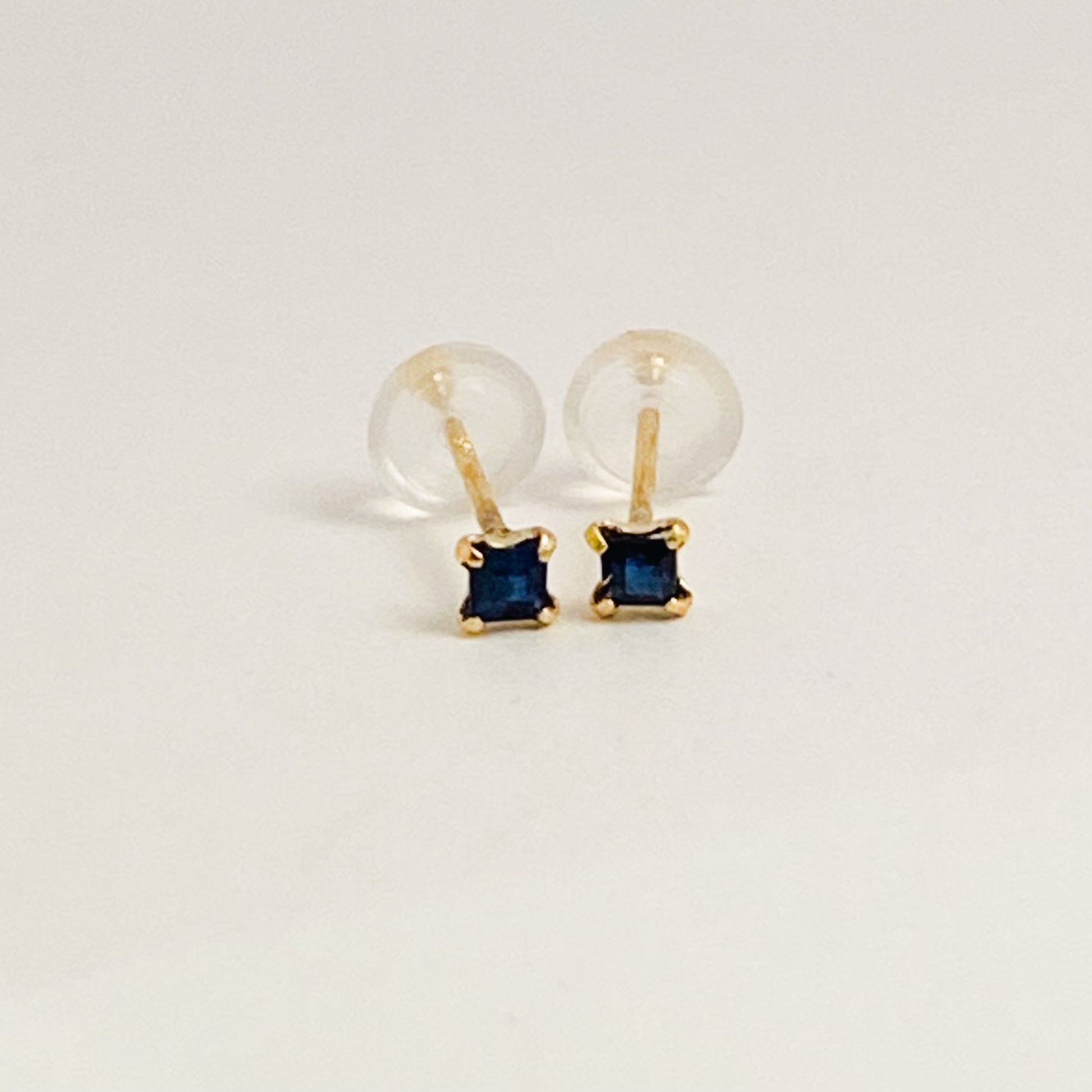 深いブルーが美しいサファイアのK18のスタッドピアスです。小さなスクエアカットが耳元でさりげなく輝きます。