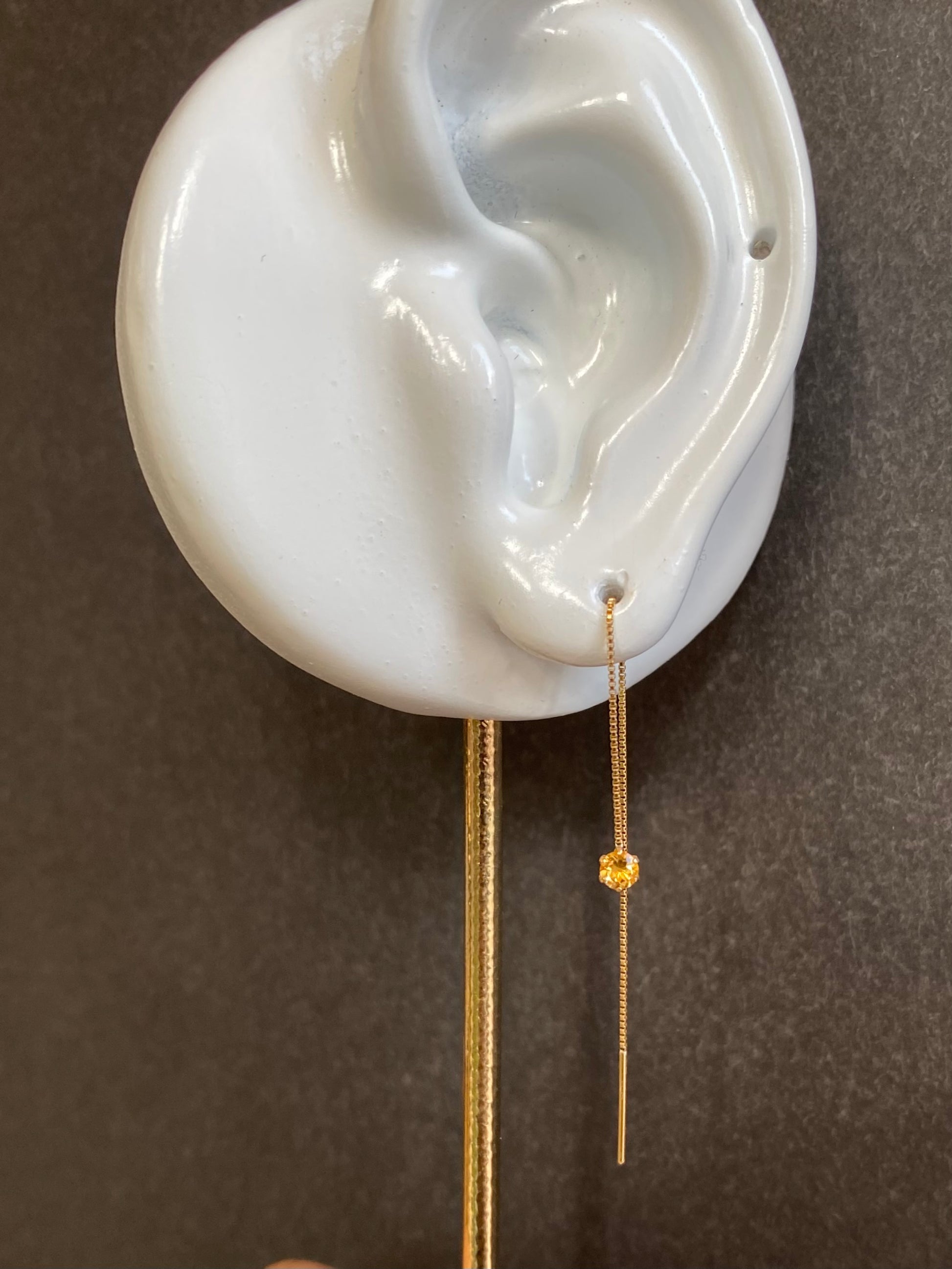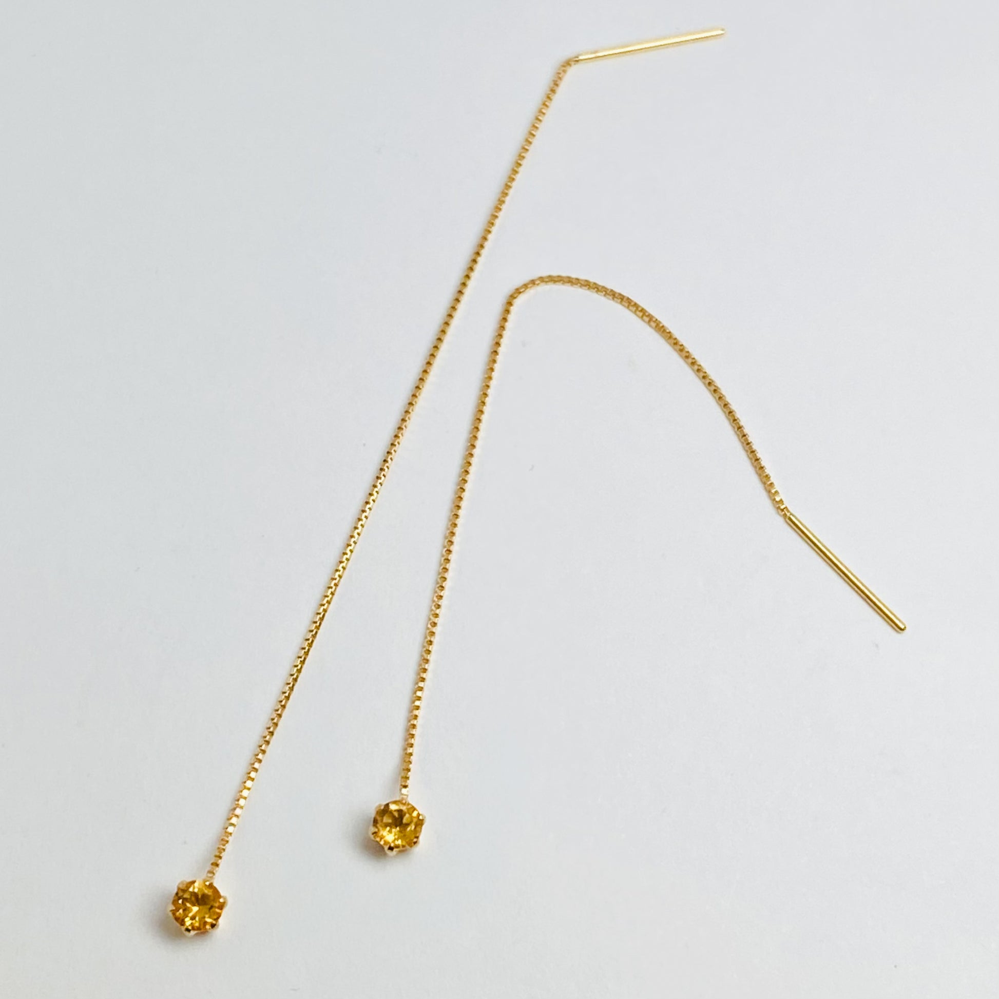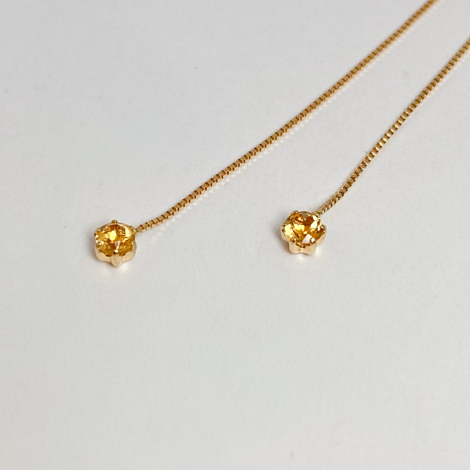 K18チェーンの先で黄金色のシトリンがきらめくピアスです。