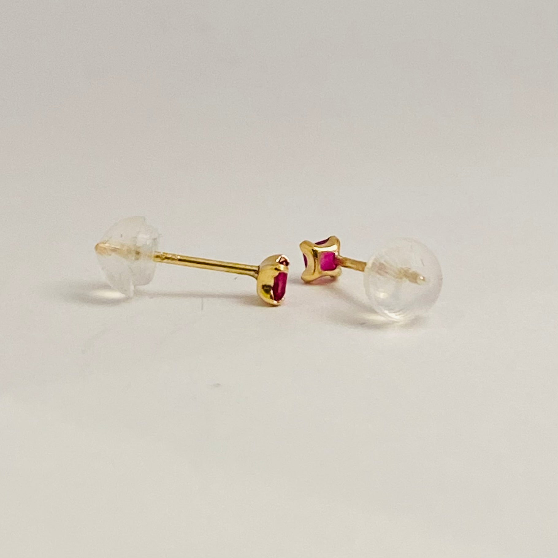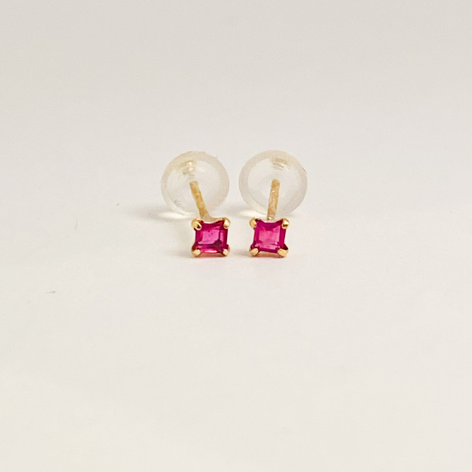 鮮やかな赤が印象的な、K18のルビーピアスです。小さなスクエアカットのルビーが耳元でさりげなく輝きます。