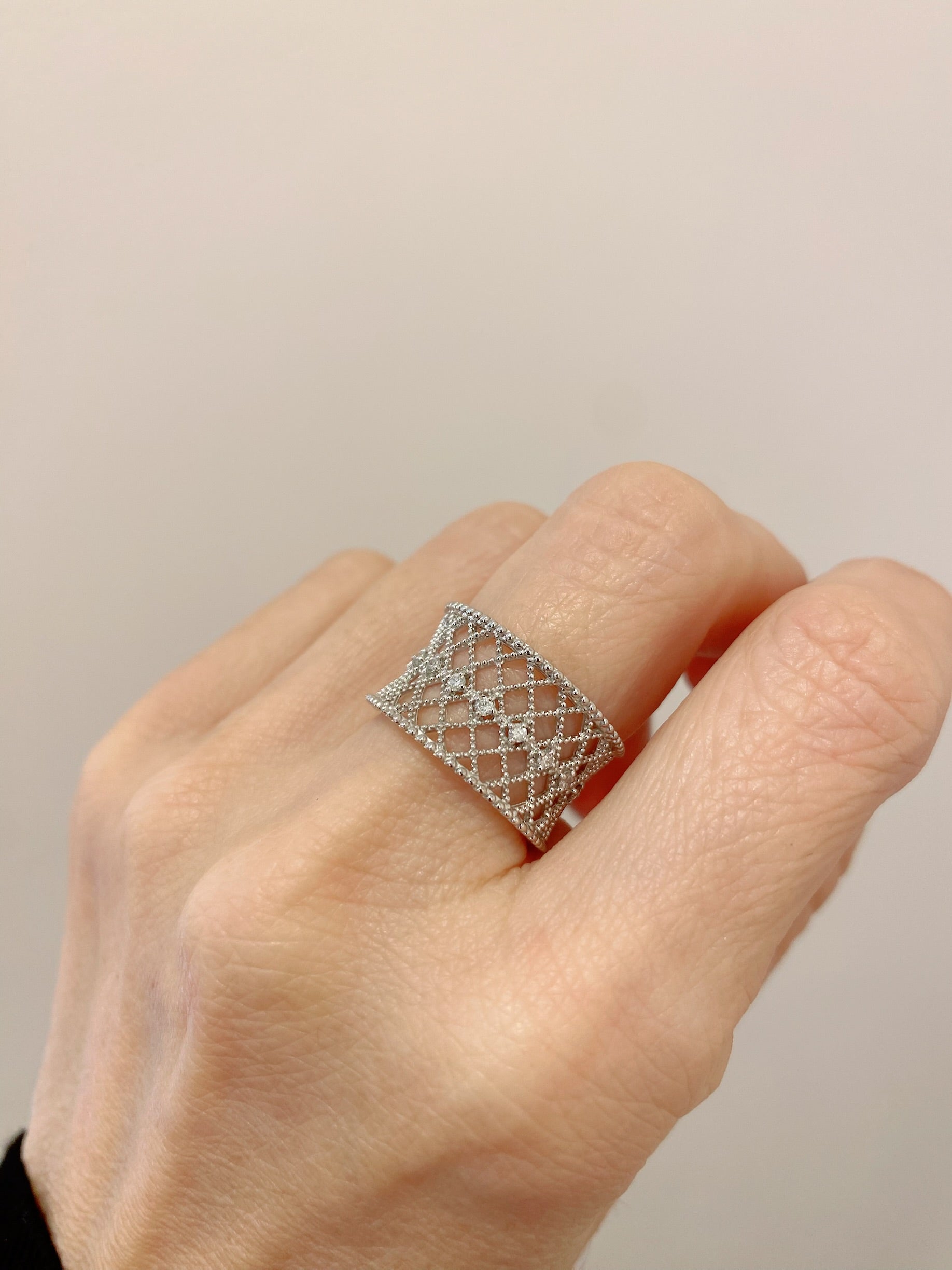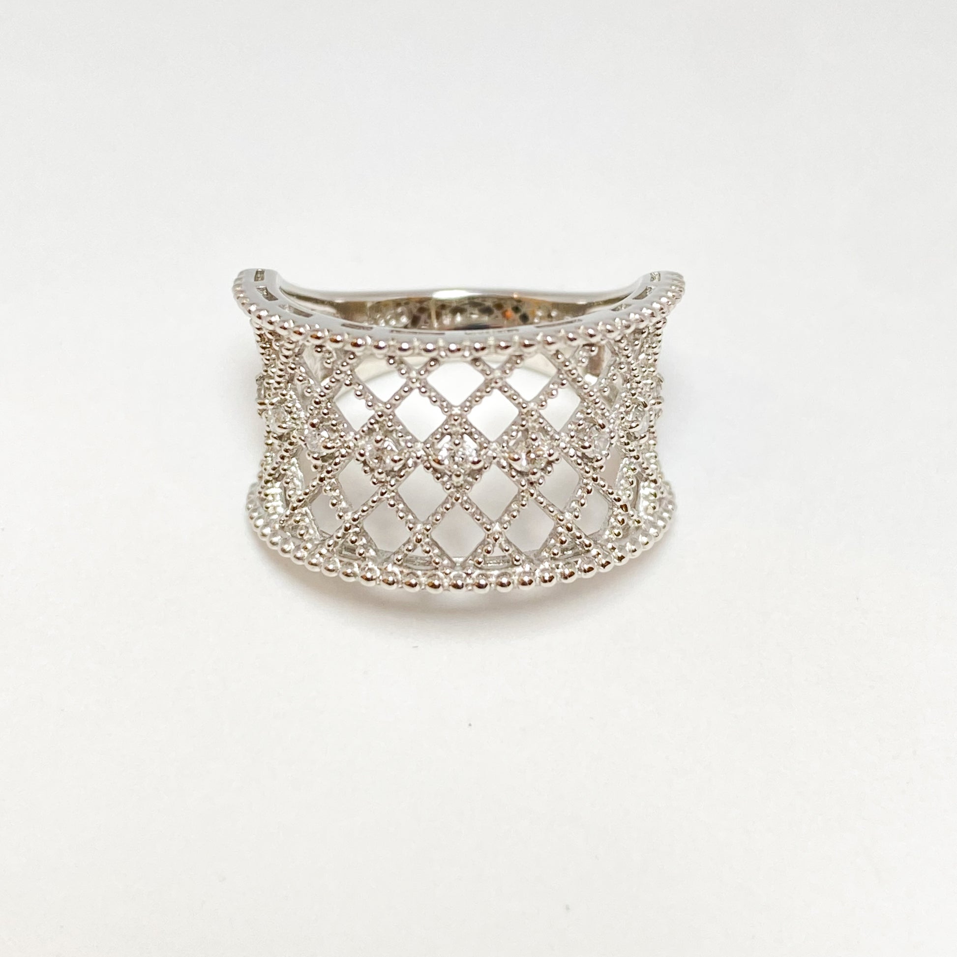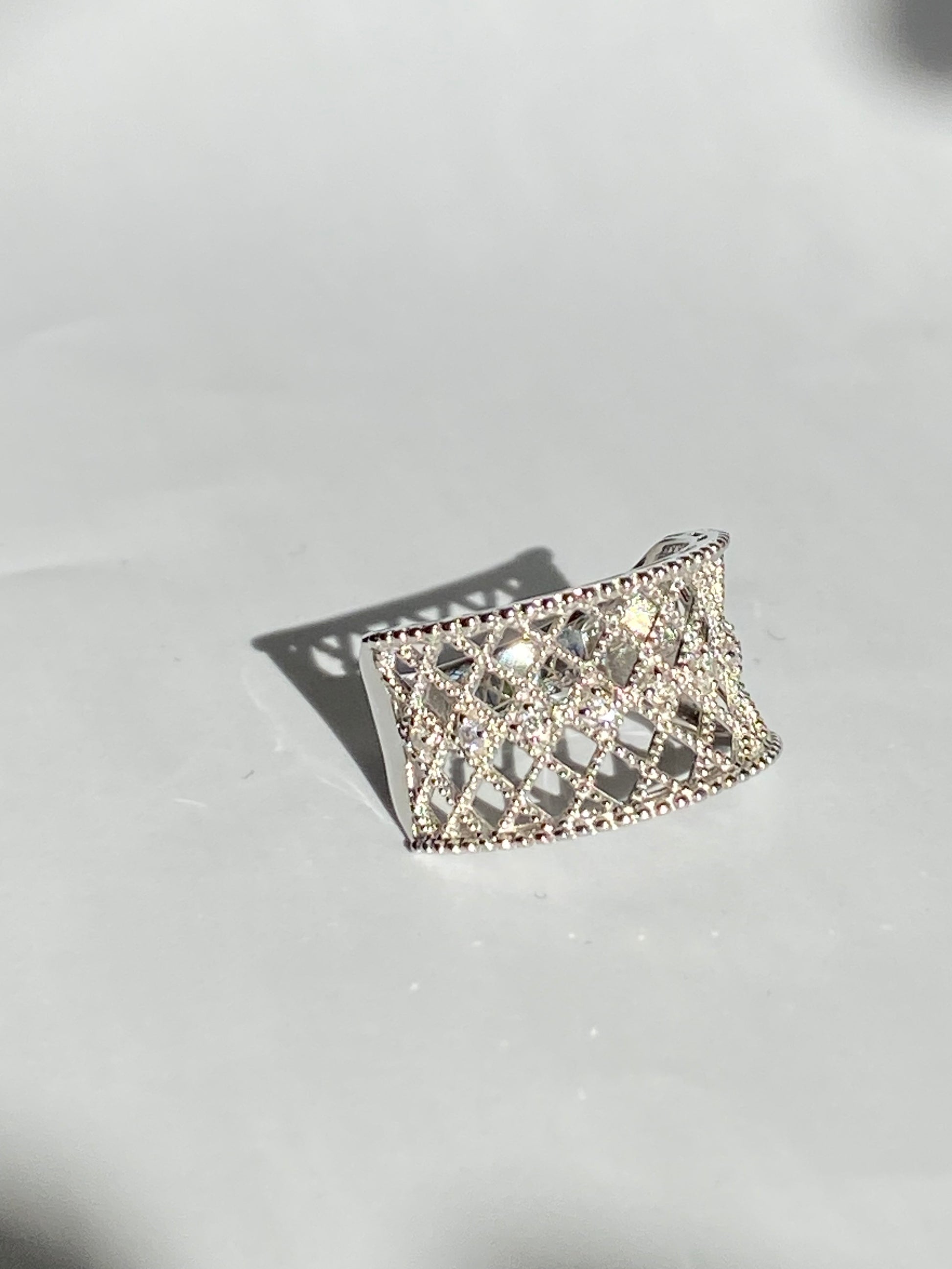 クラシックな格子柄の透かしと、粒のようなミル打ちが細やかに輝き、マットの中にダイヤモンドがふわっと映えるデザインです。