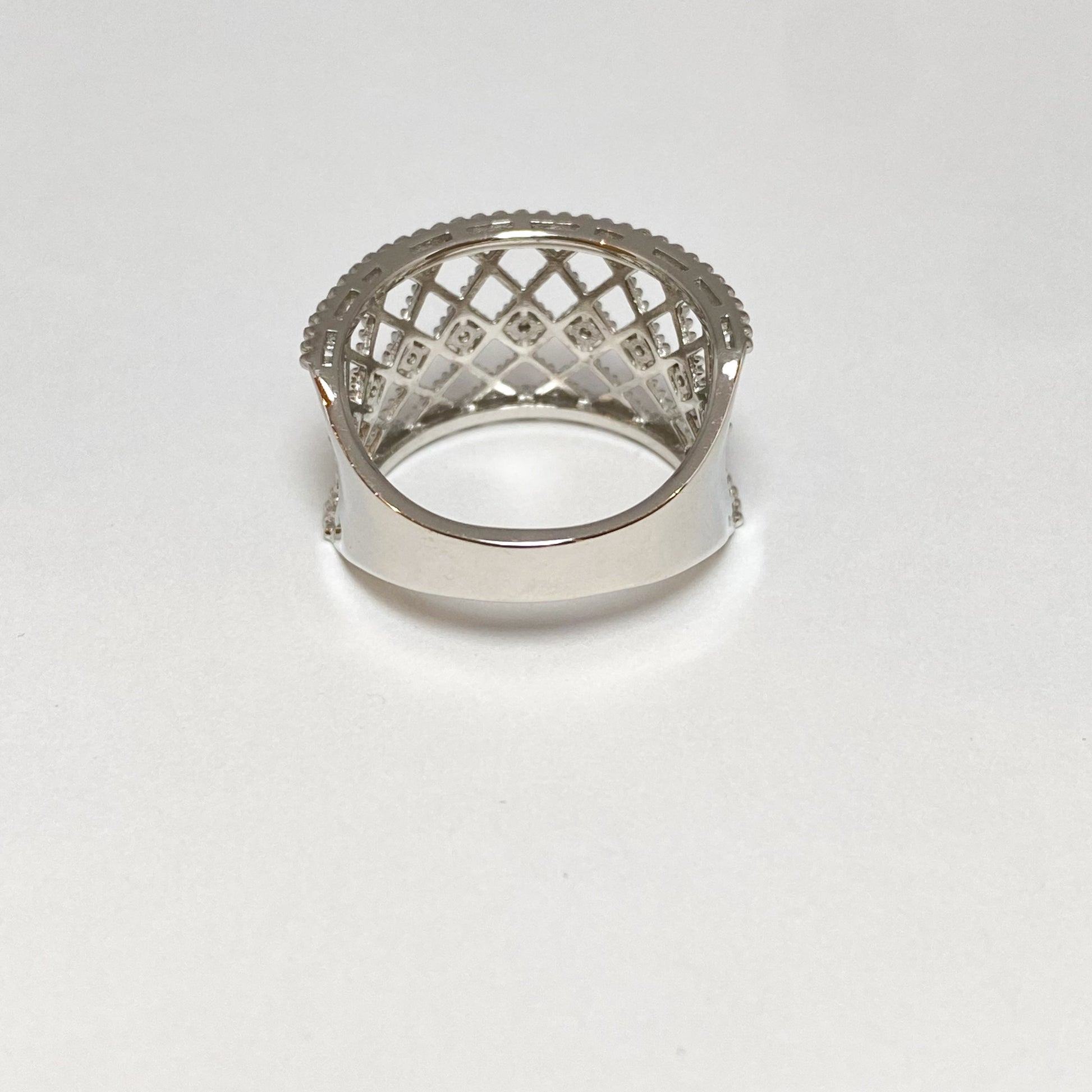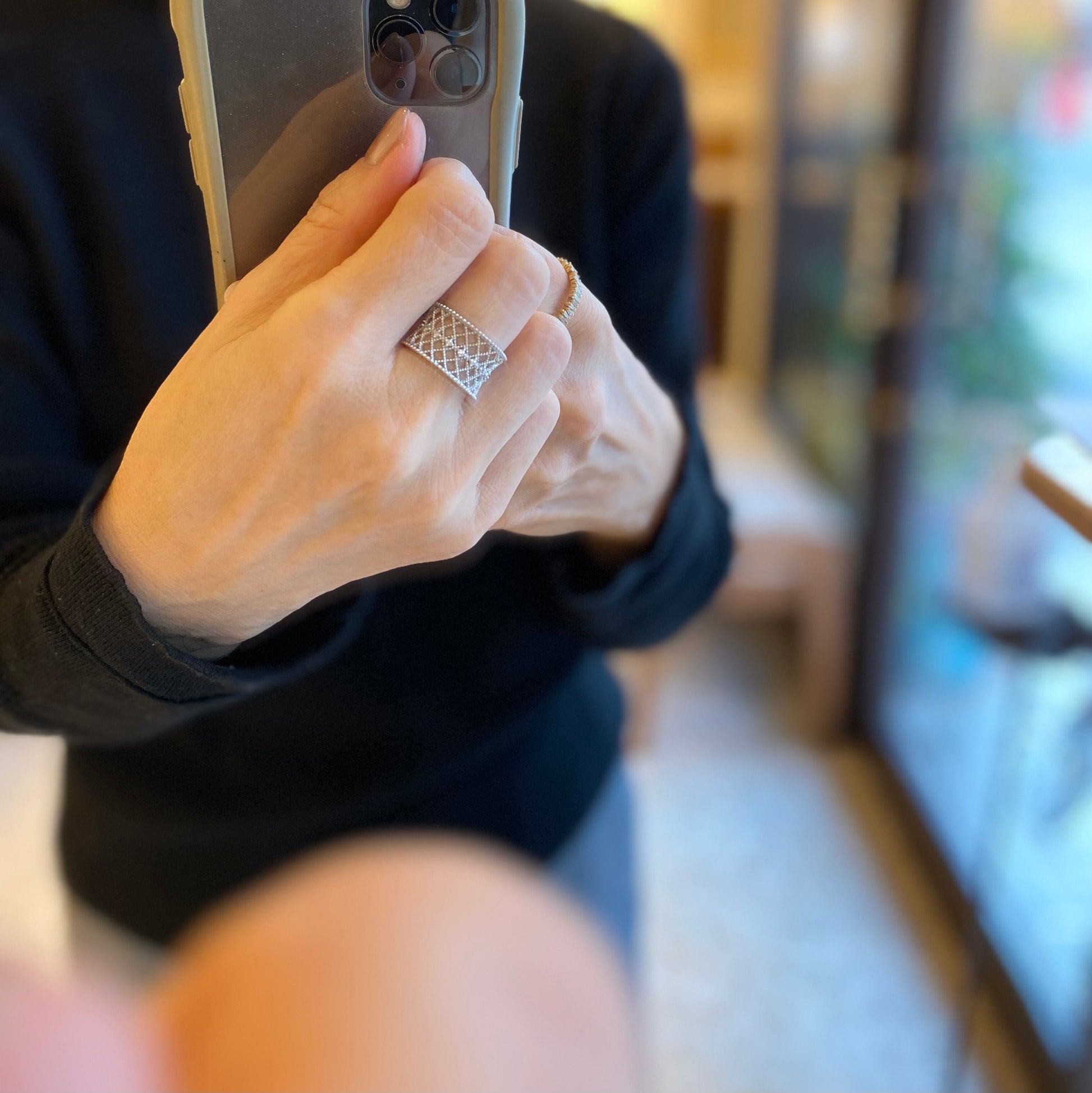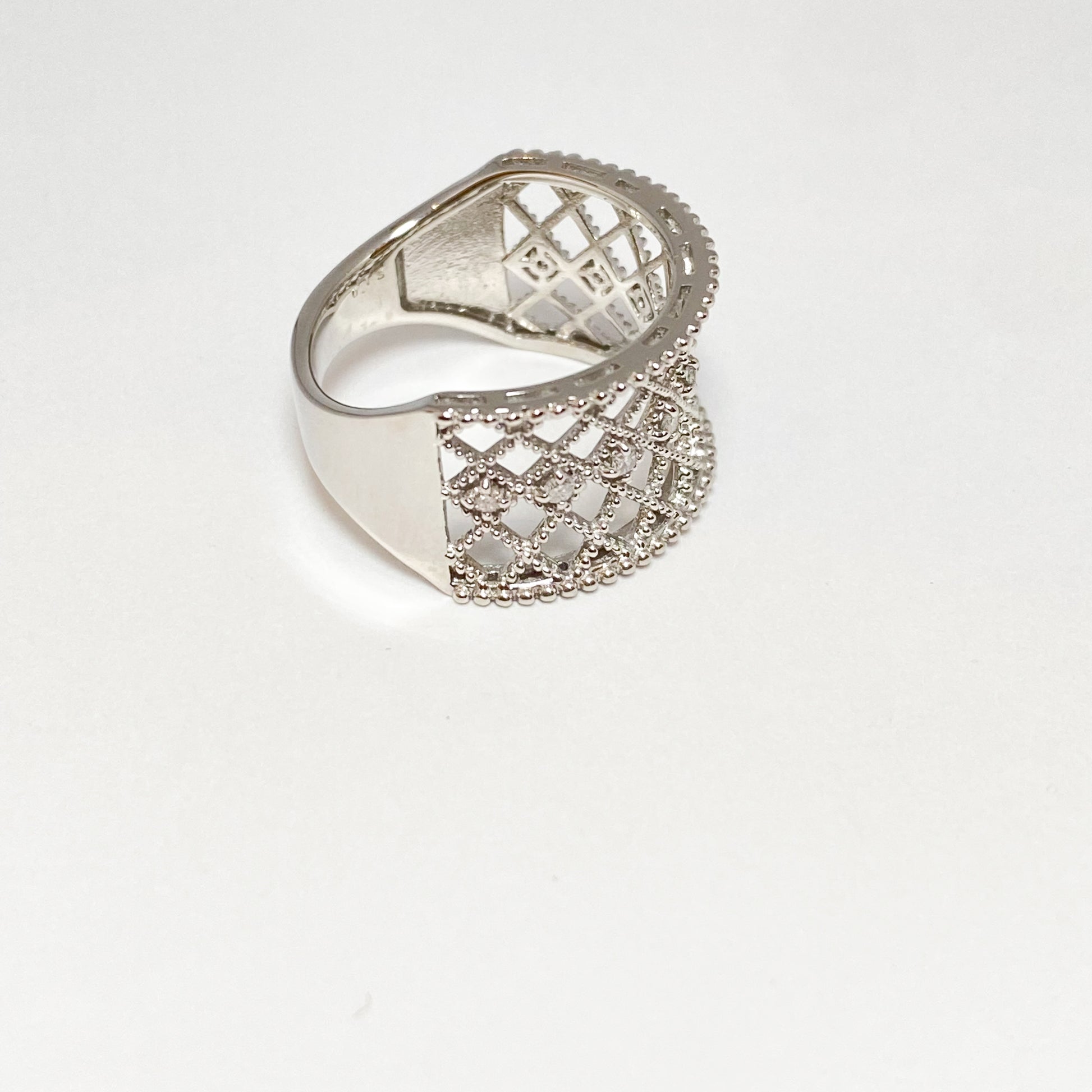 クラシックな格子柄の透かしと、粒のようなミル打ちが細やかに輝き、マットの中にダイヤモンドがふわっと映えるデザインです。