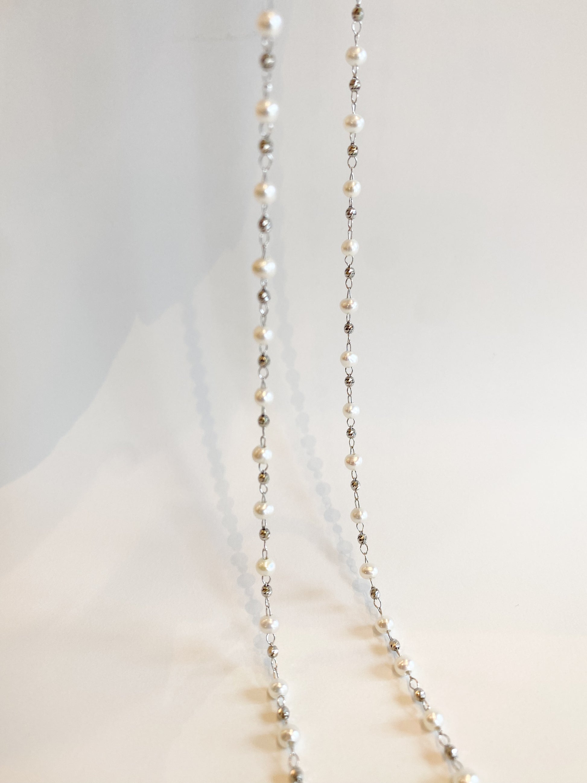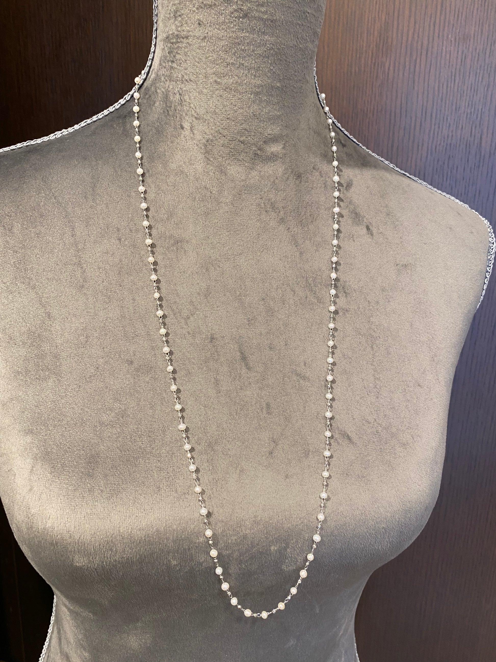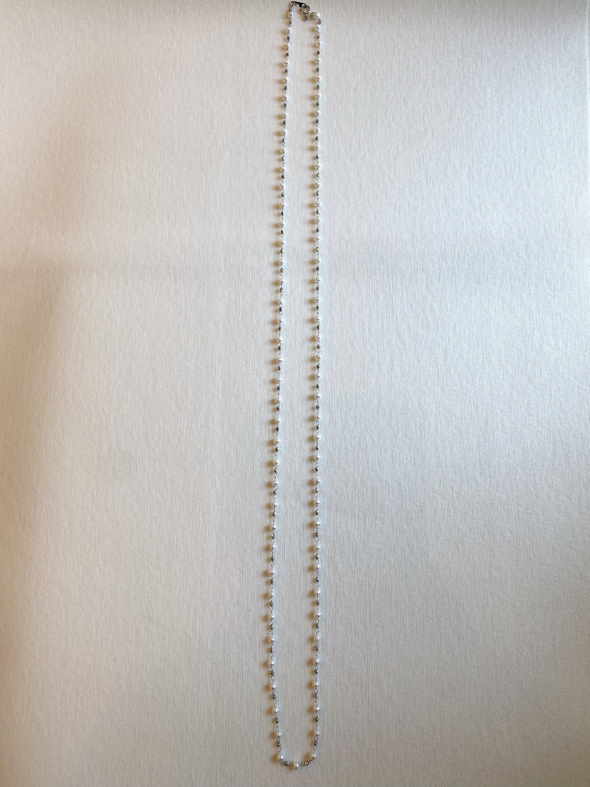 繊細なプラチナチェーンに、3.5mmの淡水パールをセッティングしたロングネックレスです。