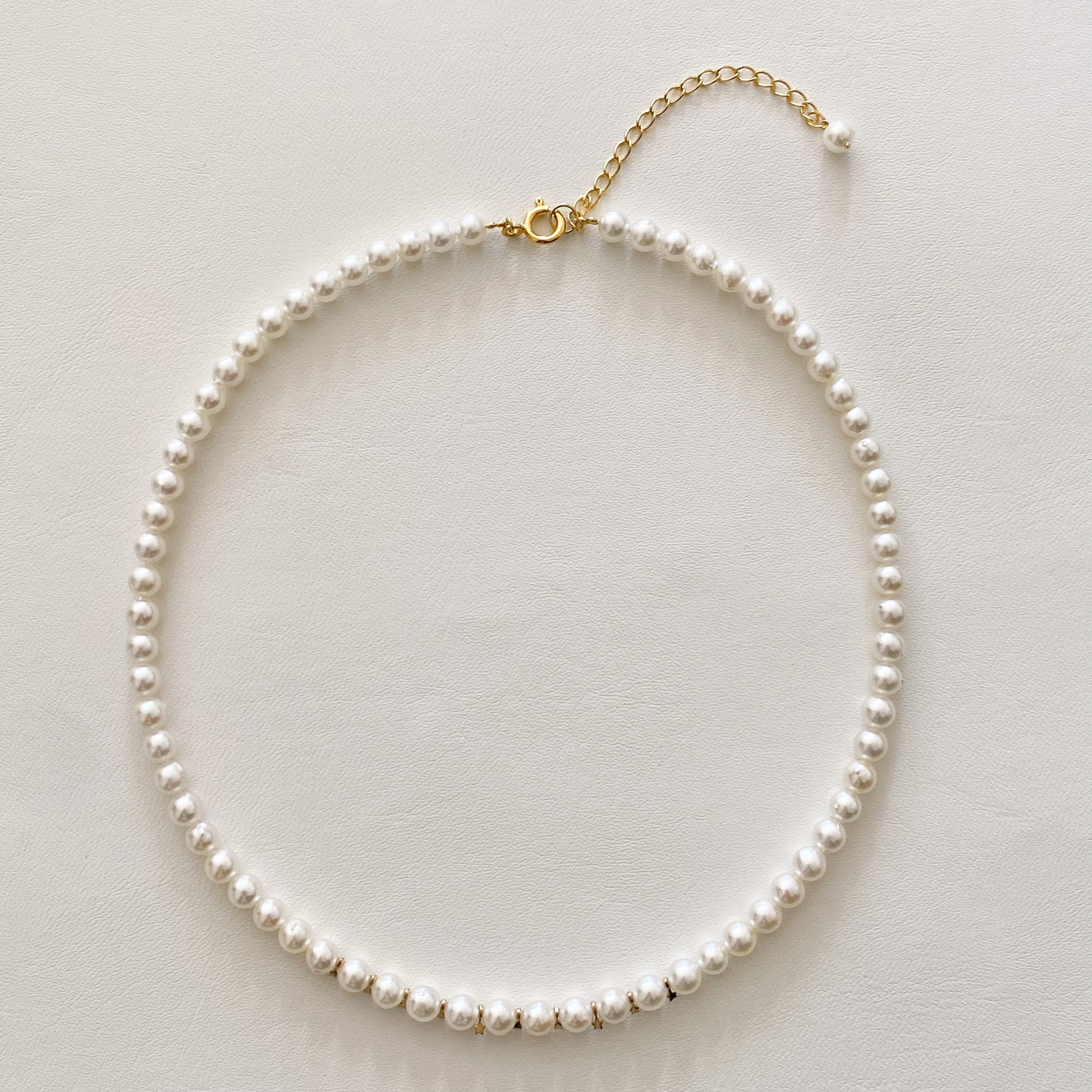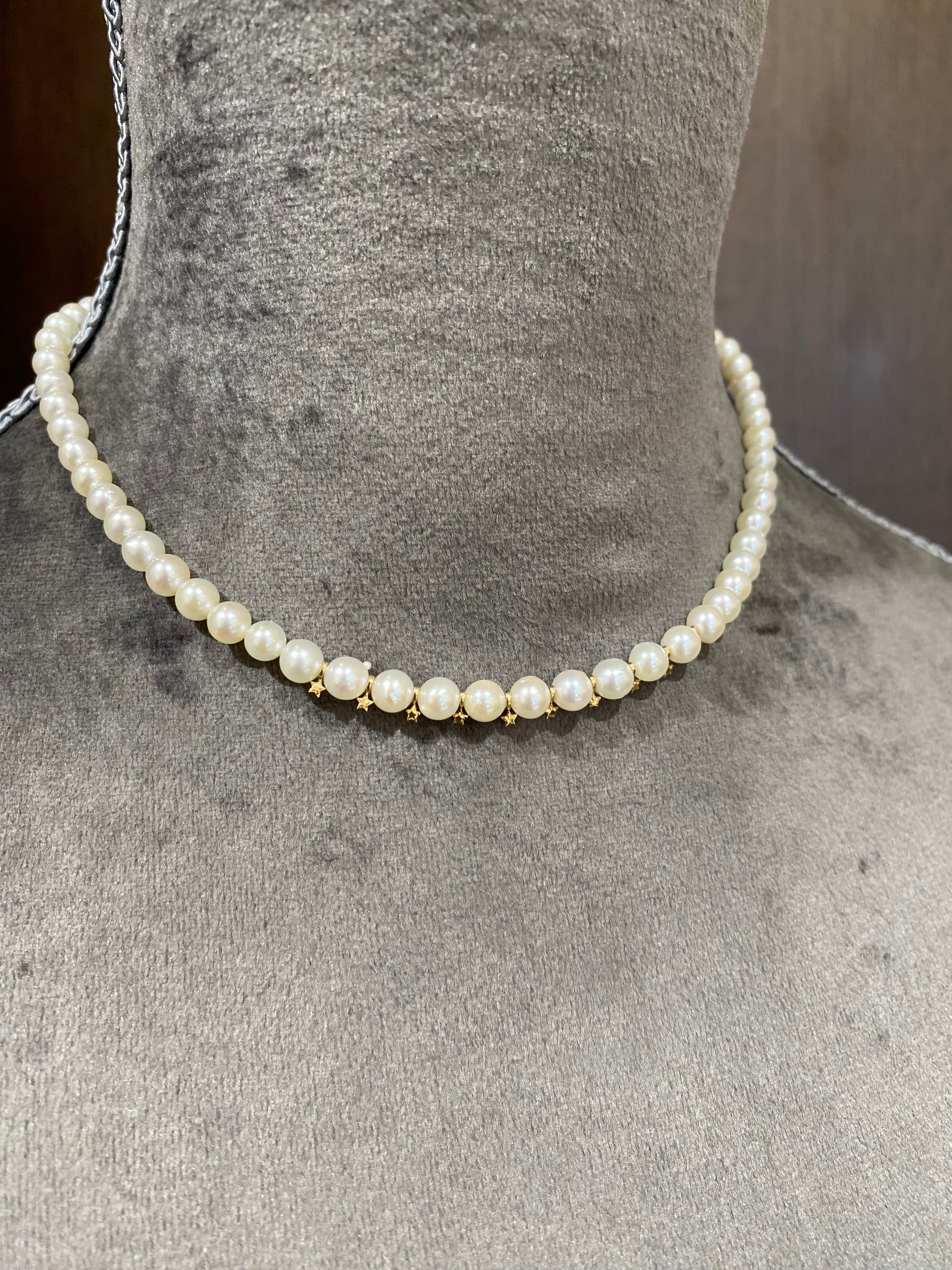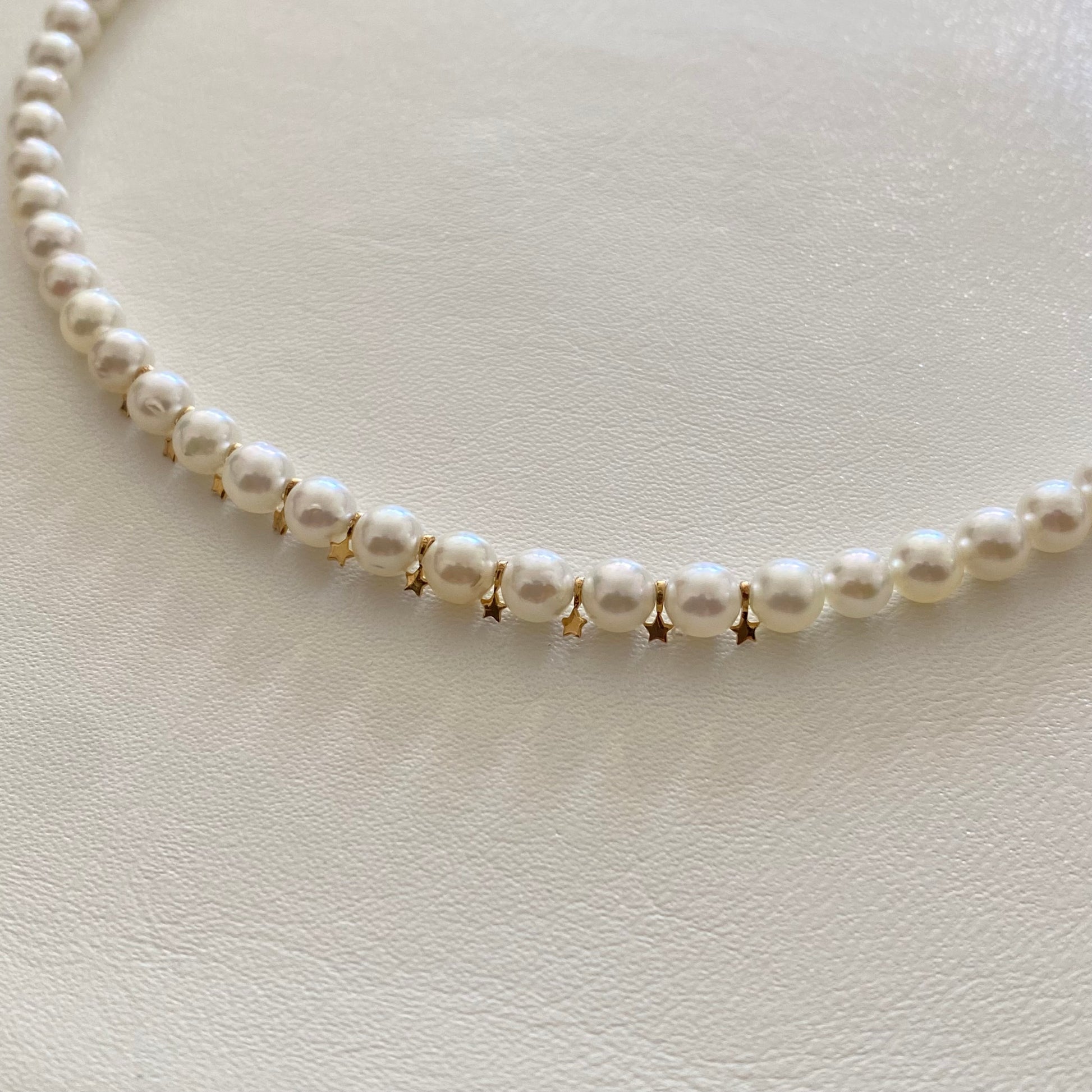 アコヤ真珠(約5.5mm)のチョーカータイプのネックレスです。センターには小さな星のパーツを10個組み込み、さりげないアクセントに。星パーツはK14、金具はシルバーを使用しています。シンプルなパールに遊び心を加えたオリジナルネックレス、普段使いにおすすめです。