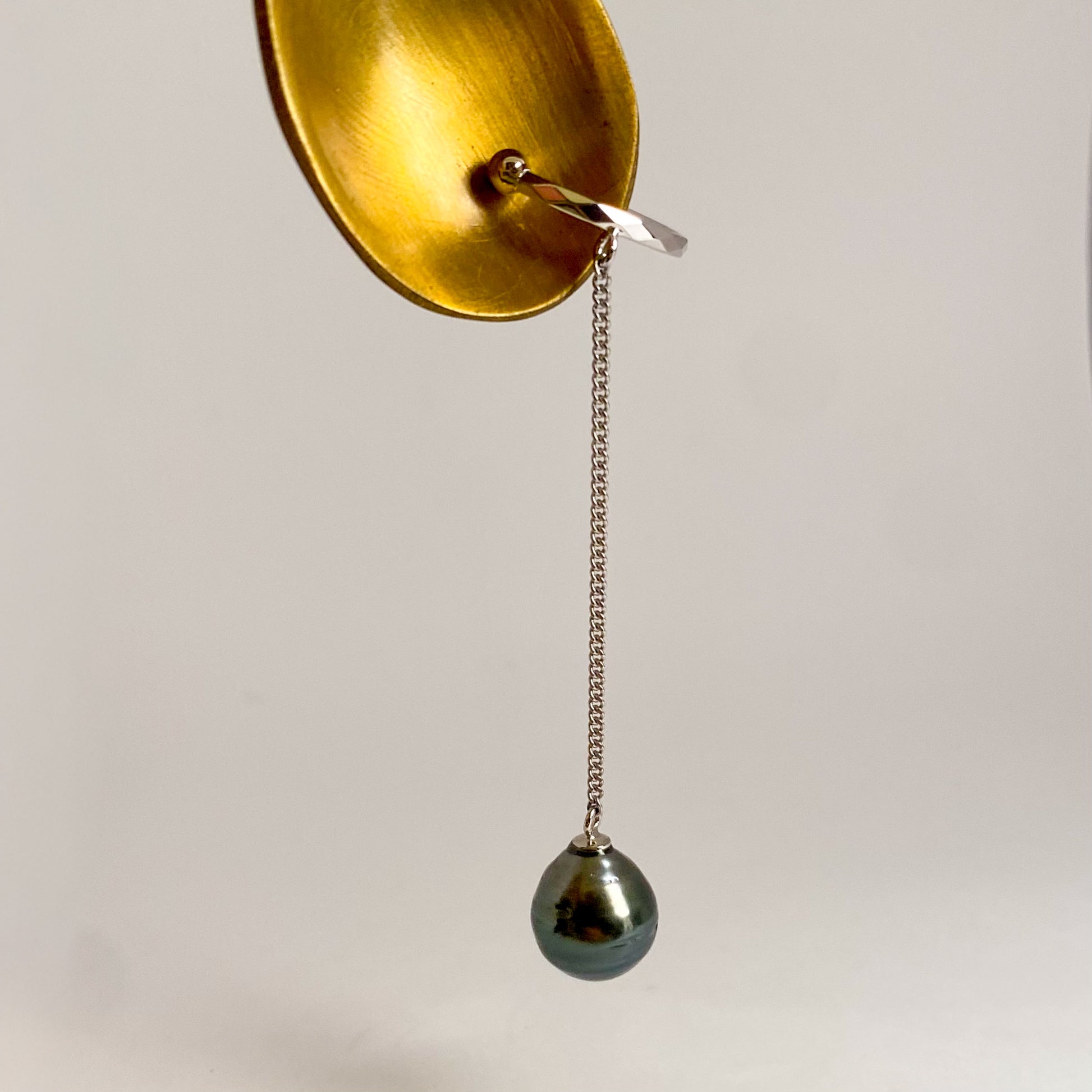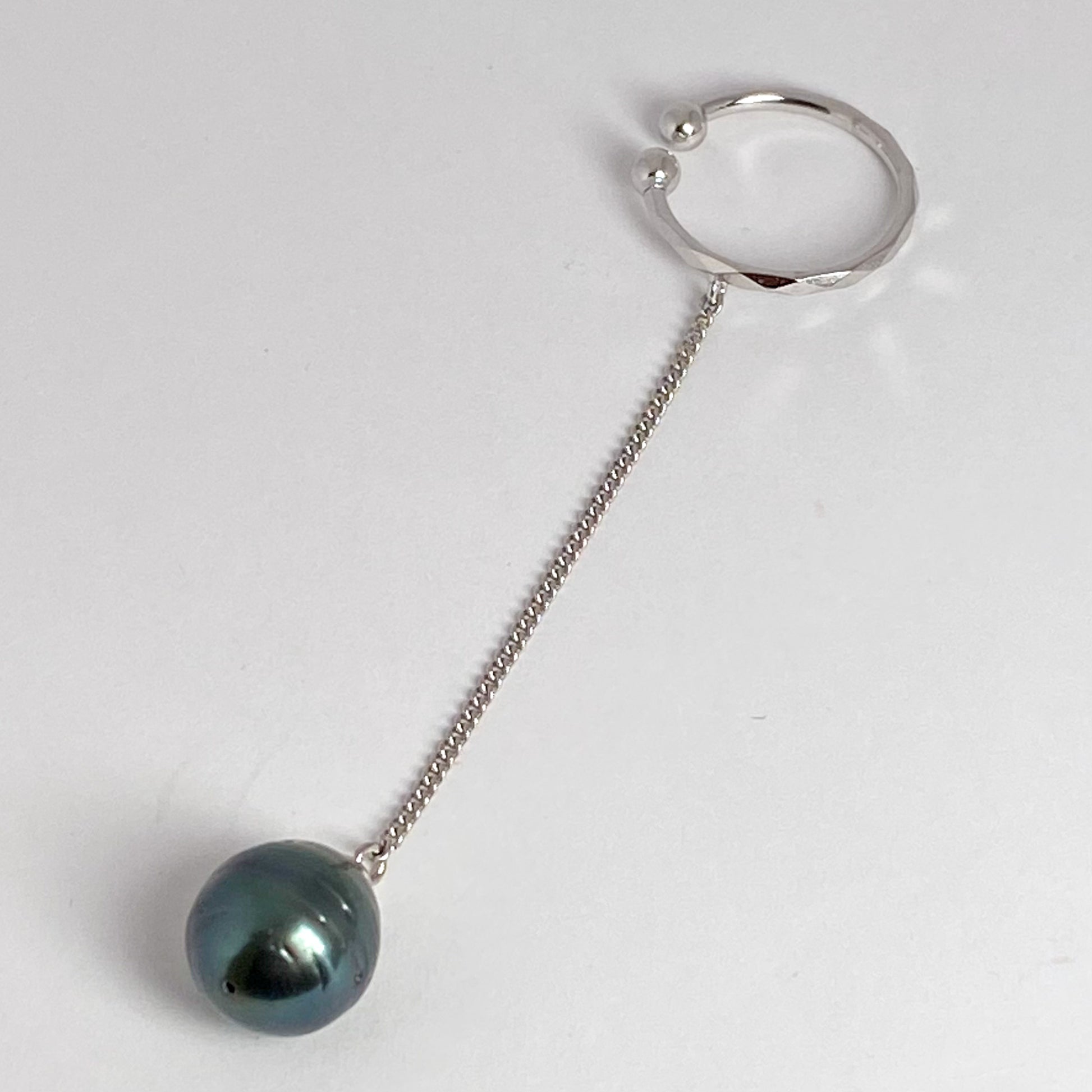 南洋黒蝶真珠が揺れ感のあるチェーンの下で揺れるカフです。カット入りのシルバー地金が、耳元でさりげなくきらめきます。
