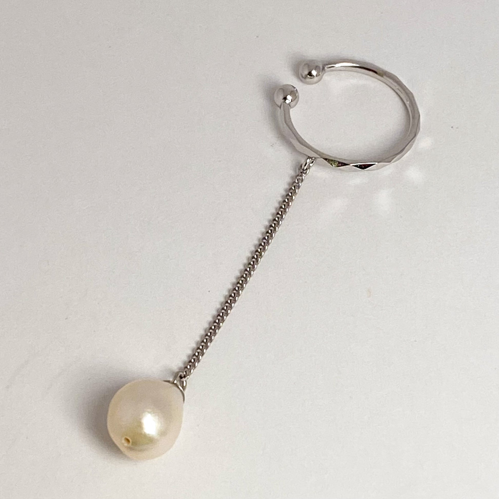 淡水パールをチェーンで揺らした、軽やかな印象のイヤーカフです。カット入りのシルバー地金が、耳元にさりげない輝きを添えます。
