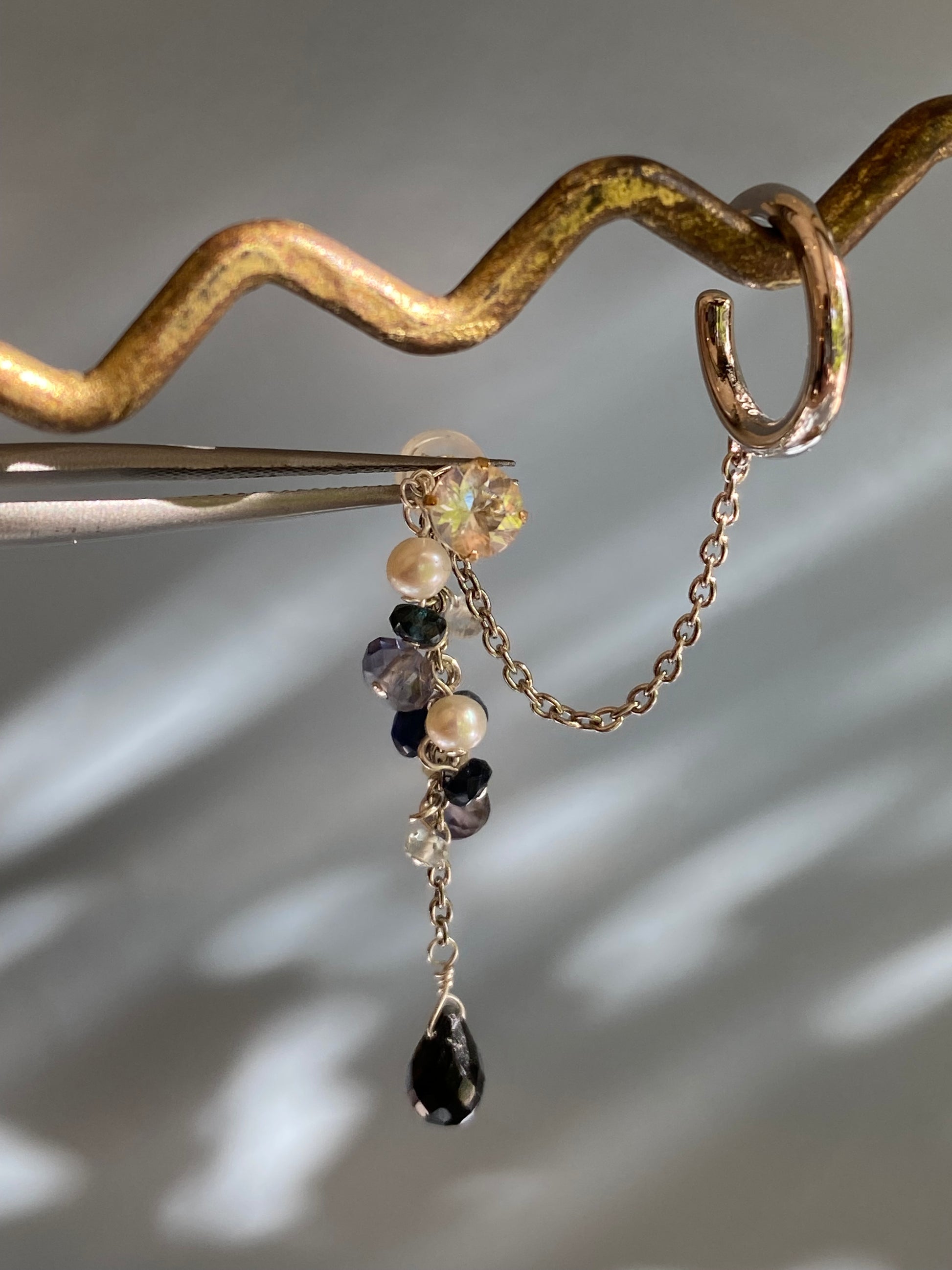 SV925のロングチェーン付きのカフにオニキスやアイオライトなど、シックなカラーの天然石をミックスした3WAY仕様のイヤーカフです。