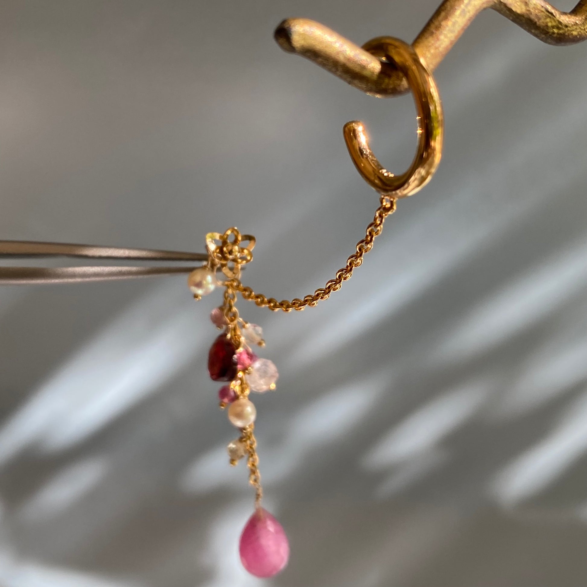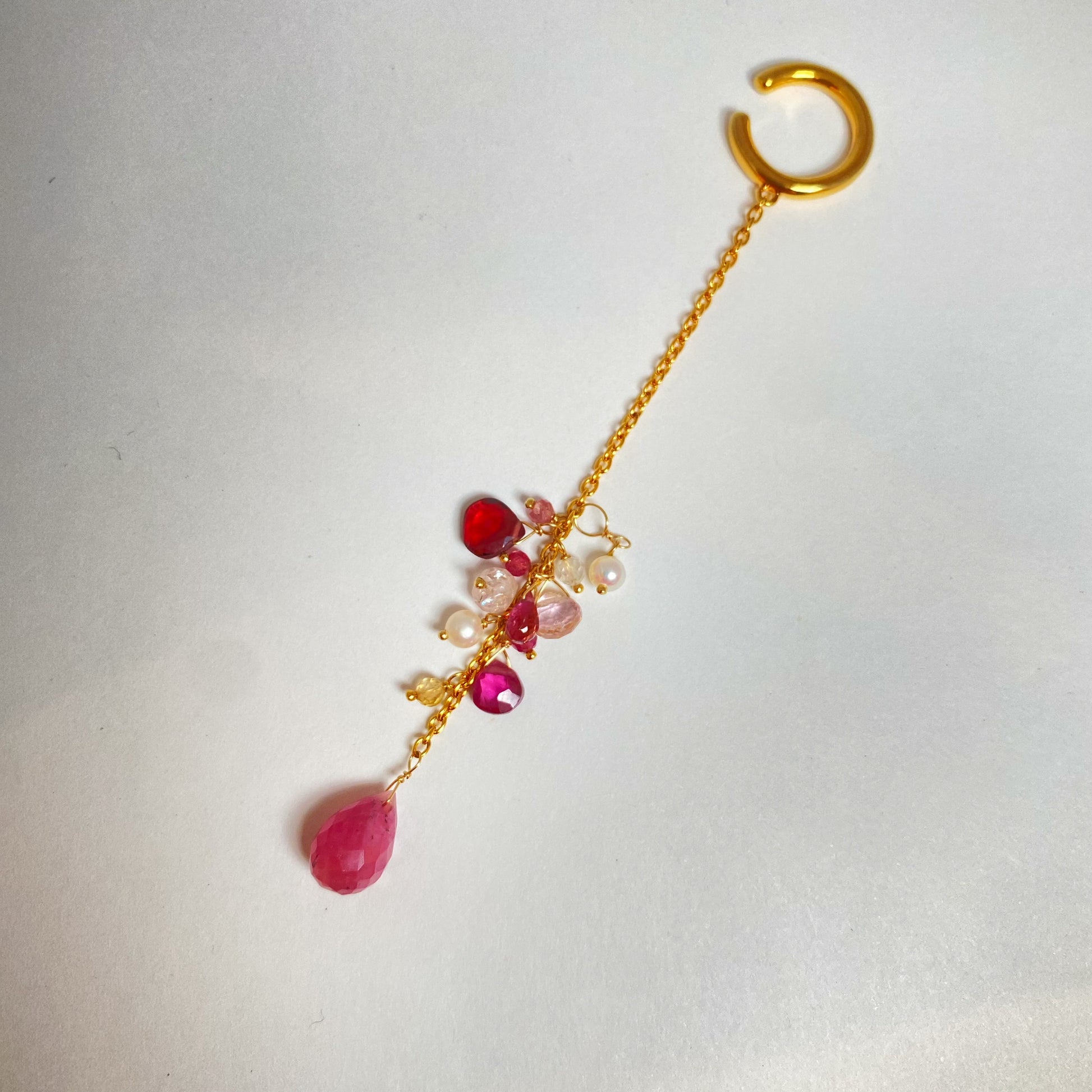 SV925のロングチェーン付きのカフにピンクサファイアやルビーなど、華やかなピンク~レッド系の天然石をミックスした3WAY仕様のイヤーカフです。